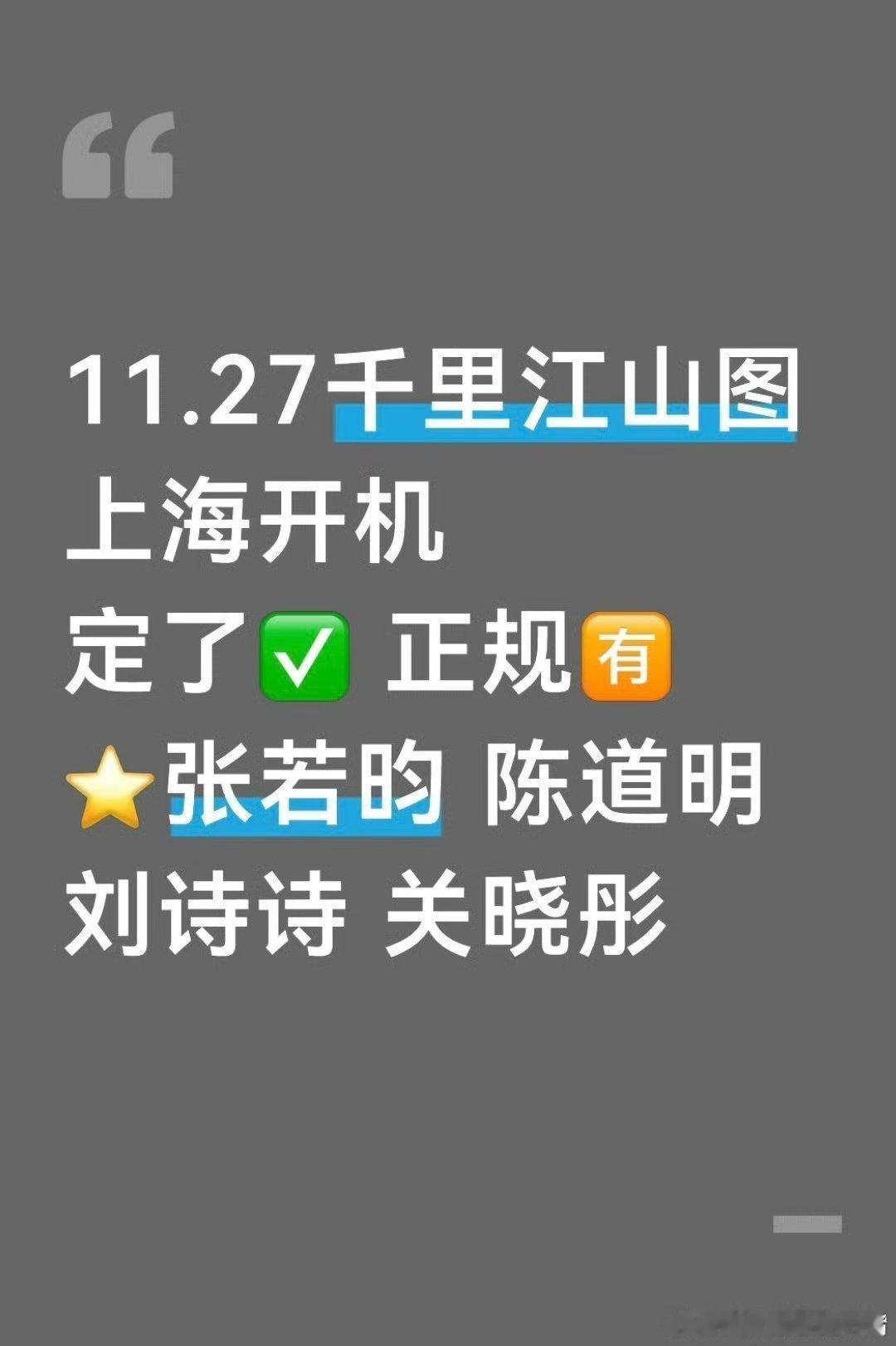 千里江山图开机《千里江山图》11月27日上海开机!张若昀 刘诗诗 陈道明 关晓彤 孙怡等等