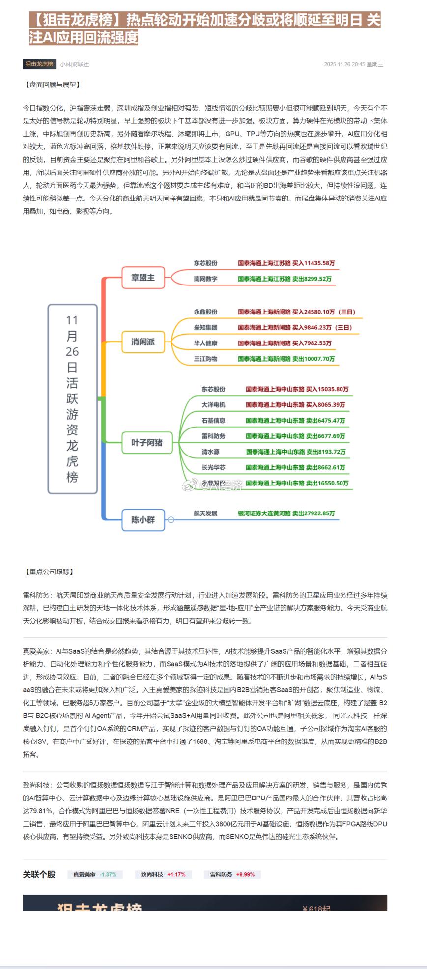 复盘:【狙击龙虎榜】热点轮动开始加速分歧或将顺延至明日关注AI应用回流强度