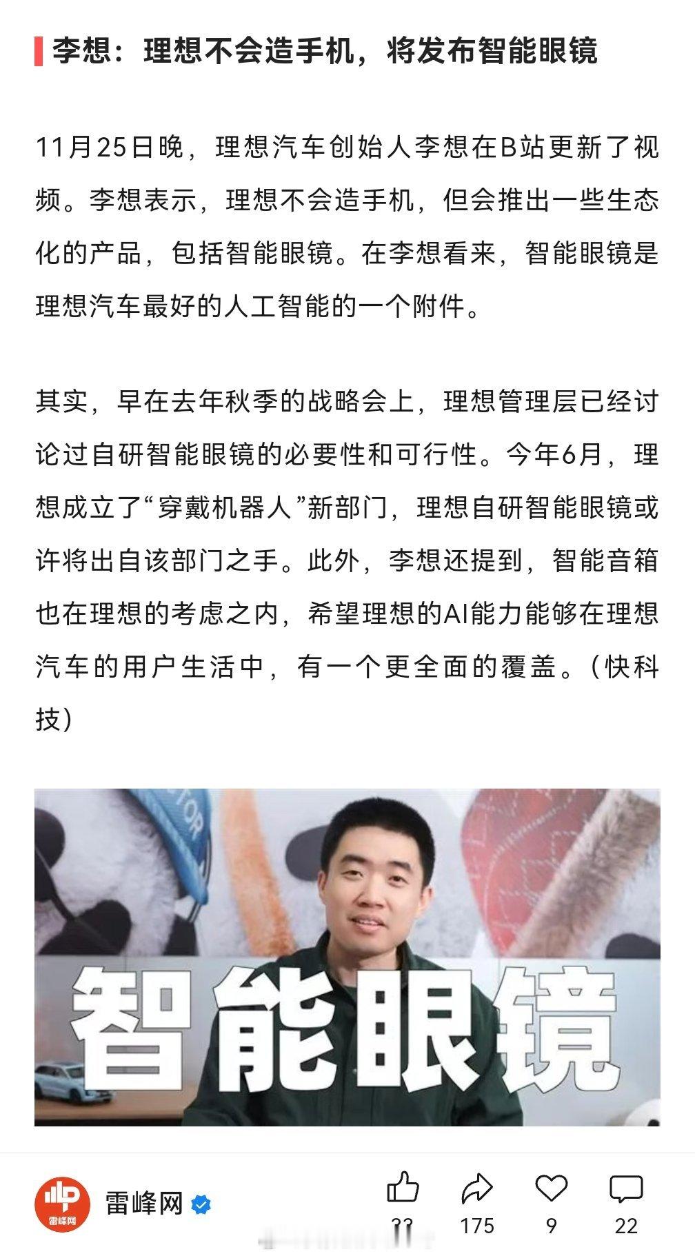 理想不搞手机搞智能眼镜,这个也没看懂,智能眼镜根本卖不了几个。个人看法还是应该聚焦在车本身上,AI不那么重要,甚至智驾都没那么重要,理想的投入在智驾上也只能搞防御,做不过华为或者momenta就没大意义,后面应该还会被小米超过。卖好车,在激烈的市场竞争中先生存下来,才有能力玩这些,现在买车智驾对多数人也不是必选项。