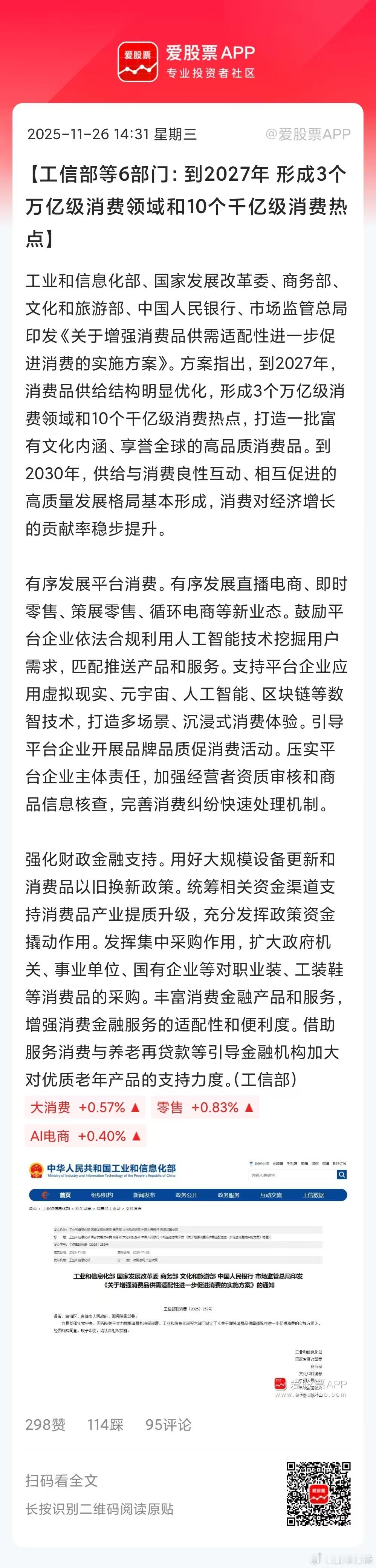 国家发文促消费了,这是“二十届四中全会后首个促消费文件”。6部门联合印发,规格还是很高的!《方案》 明确提出,到2027年,形成3个万亿级消费领域和10个千亿级消费热点。这对消费股无疑注入了一剂强心针。文件发布时A股还没有收盘,大消费板块出现暴动,遥望科技、东百集团、国光连锁、三江购物集体拉涨停,欢乐家一度20%封板!但茅台、五粮液、伊利这些消费白马股却没反应,看来机构不认啊。刀锋总结,影响消费的三个因素,一是觉得自己有钱,才会消费,主要靠资产上涨;二是工资+收入上涨,这是实实在在的消费第七;三是信心,觉得未来自己能赚钱,才敢提前消费。总之,促消费最好的方式是提振就业、增加收入、完善社会保障(生育补贴、教育、养老这些)。其次是发补贴,比如发钱,发优惠券,以旧换新等等!明天上午10点国新办举行吹风会 看看会不会有更大更给力的措施出来。消费股今年挨揍了一年,年底也该表现一下了!重点关注海南封关的免税消费,旅游冰雪等旅游消费、年轻人的宠物潮玩等新消费。
