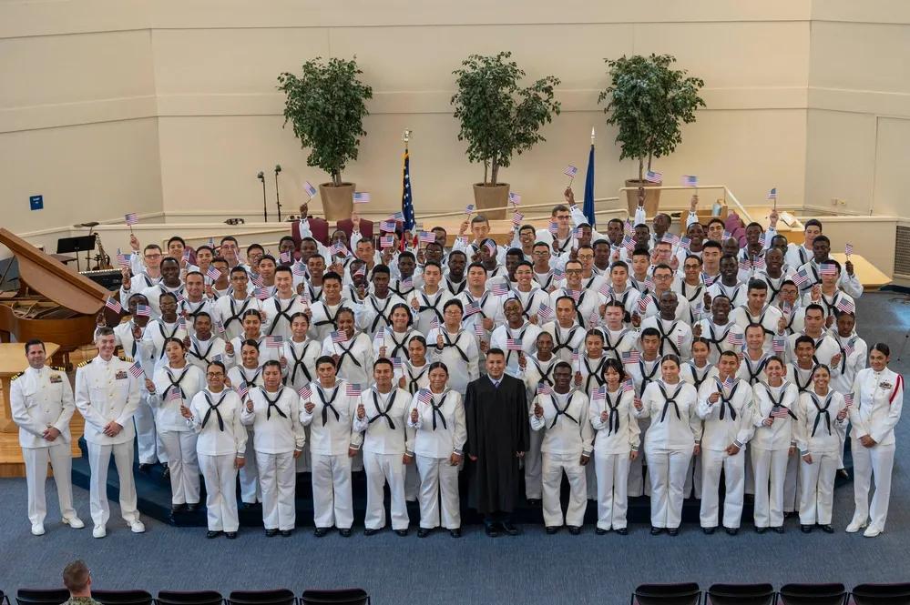通过参军入籍美国的黑人与亚裔人也不少。 2025年10月2日,美国新兵在海军新兵培训指挥部的纪念礼拜堂内参加入籍仪式时宣誓效忠美利坚合众国。新兵 的培训大约为期九周,所有加入美国海军的新兵都在该指挥部开始他们的军旅生涯。