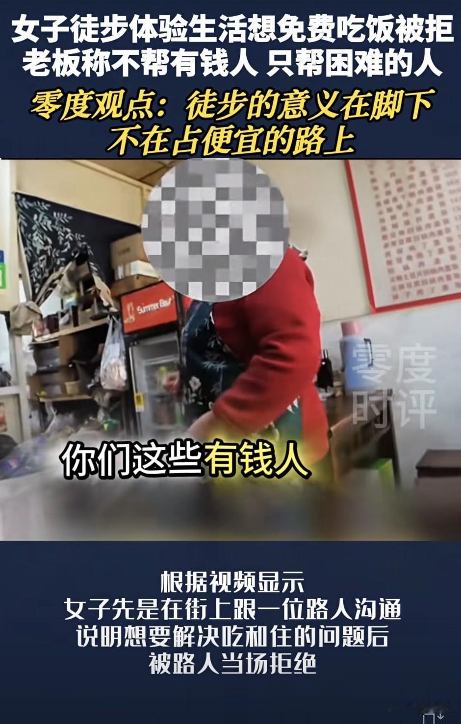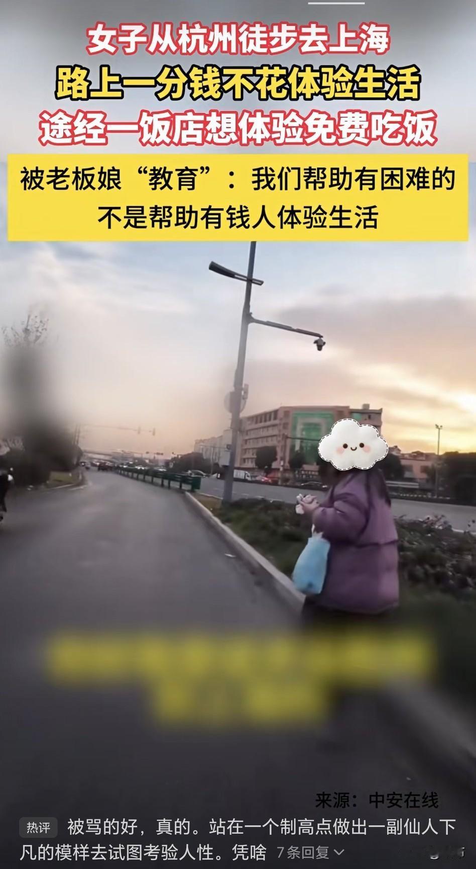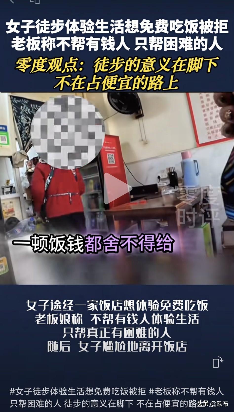 有钱人体验化缘遭拒,饭店老板娘,“我们只帮助需要帮助的人。” 近日,视频中一个女子自称徒步从杭州到上海,路上一分钱不花体验生活。途径饭店想体验免费用餐被老板娘狠狠教育了一番,老板娘的话得到网友的深度认可。 事情是这样的,最先是在一条村路上,一女子的声音像对面一年轻女子求助,她自我介绍说,“我是从杭州徒步去上海体验生活的,吃和住都得自己解决,我能请你帮个忙吗?对面女子直接回答“不能。” 紧接着,视频中女子来到一个小饭店,饭店大姐立马回绝,“你们这些有钱人,连一顿饭钱都不舍得给, 我们只帮助有困难的,不是帮助有钱人体验生活的。”对大姐机关枪一样的灵魂拷问,女子尴尬地说“好了好了大姐。”然后灰溜溜地离开了。 大姐的举动简直是大快人心啊,众网友纷纷表示怼的好。对于这种巧立名目蹭吃蹭喝的人就应该不留任何情面的拒绝,别人凭什么要为你的爱好买单? 还有一点是真心佩服这些人的心理素质那真是一个强大,她们是怎么做到伸手要饭还要的理直气壮的呢?