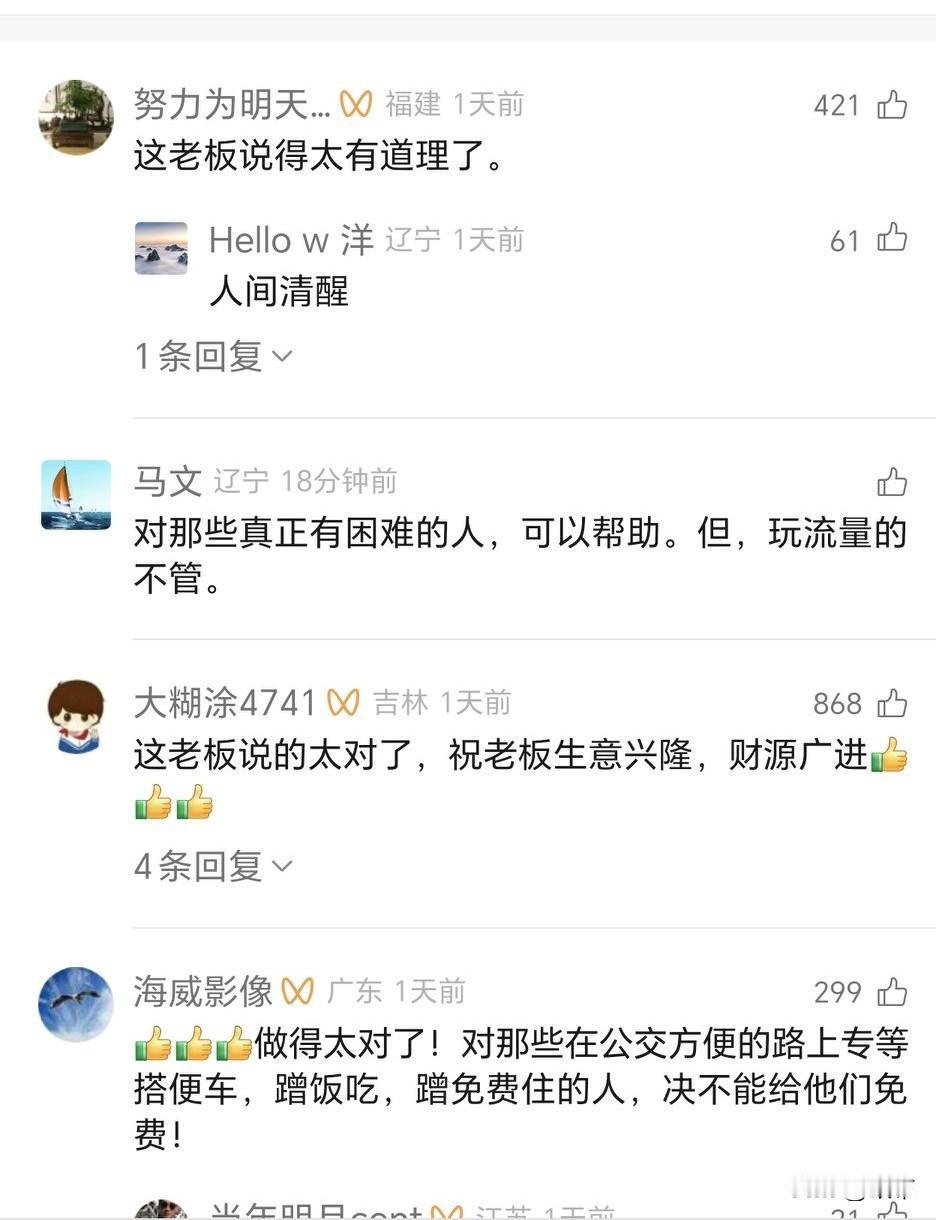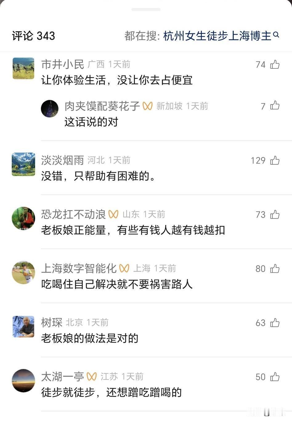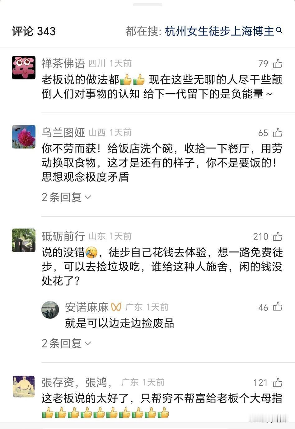 有钱人体验化缘遭拒,饭店老板娘,“我们只帮助需要帮助的人。” 近日,视频中一个女子自称徒步从杭州到上海,路上一分钱不花体验生活。途径饭店想体验免费用餐被老板娘狠狠教育了一番,老板娘的话得到网友的深度认可。 事情是这样的,最先是在一条村路上,一女子的声音像对面一年轻女子求助,她自我介绍说,“我是从杭州徒步去上海体验生活的,吃和住都得自己解决,我能请你帮个忙吗?对面女子直接回答“不能。” 紧接着,视频中女子来到一个小饭店,饭店大姐立马回绝,“你们这些有钱人,连一顿饭钱都不舍得给, 我们只帮助有困难的,不是帮助有钱人体验生活的。”对大姐机关枪一样的灵魂拷问,女子尴尬地说“好了好了大姐。”然后灰溜溜地离开了。 大姐的举动简直是大快人心啊,众网友纷纷表示怼的好。对于这种巧立名目蹭吃蹭喝的人就应该不留任何情面的拒绝,别人凭什么要为你的爱好买单? 还有一点是真心佩服这些人的心理素质那真是一个强大,她们是怎么做到伸手要饭还要的理直气壮的呢?
