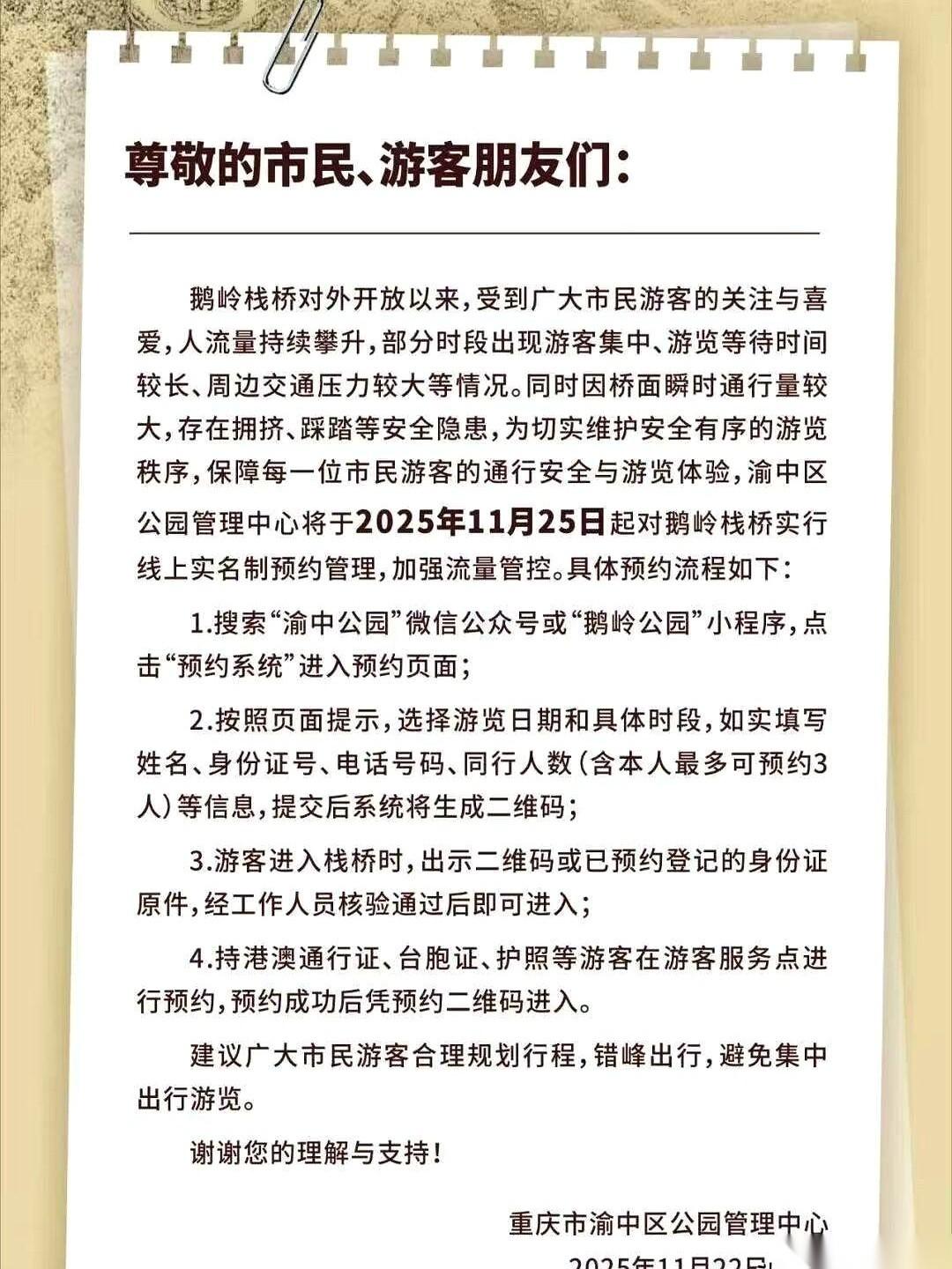鹅岭那座桥,终于要预约了。 说真的,再不管管,佛图关公园的门槛子都要被踩烂了。每天乌泱泱的全是人,搞得跟春运现场一样,哪是看风景,纯纯就是去看后脑勺的。 所以,看到“线上实名预约”这几个字,我第一反应是:谢天谢地! 结果定睛一看通知,2025年11月25号才开始…… 我差点以为我手机穿越了。这是在干嘛?提前一年多发个“预告的预告”?难道中间这一年多的时间,就让大家再随便挤一挤? 也行吧。 这招一出,我估计我妈那种玩不转智能手机的,是彻底跟这地方无缘了。 一个本来谁都能去的市民公园,最后硬生生变成了年轻人的专属打卡滤镜。 有时候觉得挺矛盾的。 你嫌一个地方人多,吵,乱。可真等它用各种“门槛”把人挡在外面,变得清净了,又觉得好像少了点什么。 少了那种谁都能凑个热闹的,市井的人情味儿。 世上的事,好像都这样,方便了一群人,就总得有另一群人觉得不方便。