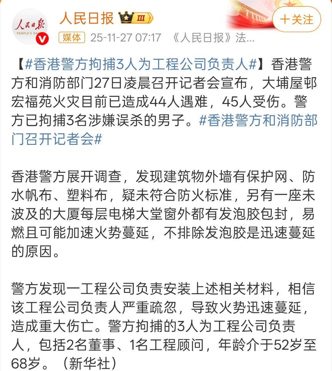 香港火灾已致44人遇难太惨了由于登记失联人数超270人,预计遇难人数还会继续增加。防火无小事,据说起火原因可能是维修工人丢弃烟头引燃竹架,竹架成“火势通道”,外墙维修竹架距墙体仅0.5米,叠加尼龙防风网未阻燃处理,强风(湿度30%-60%)下形成“烟囱效应”,火舌12分钟内蔓延5栋楼。此前居民曾多次投诉工地吸烟问题,但一直未整改。老张杂谈
