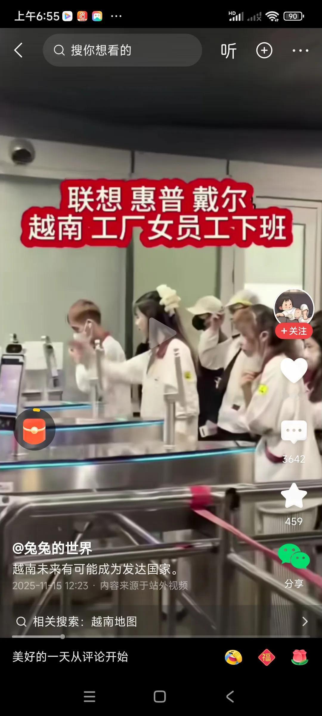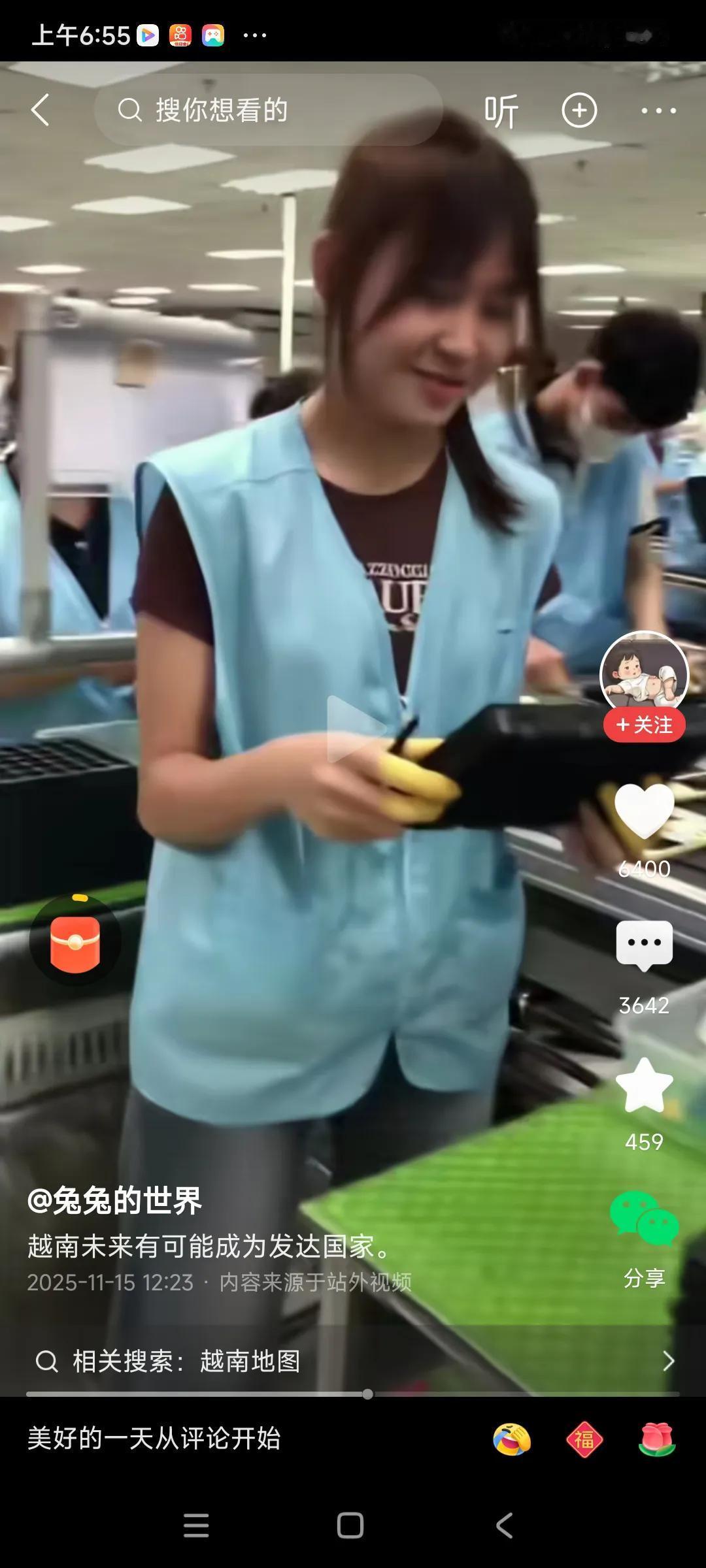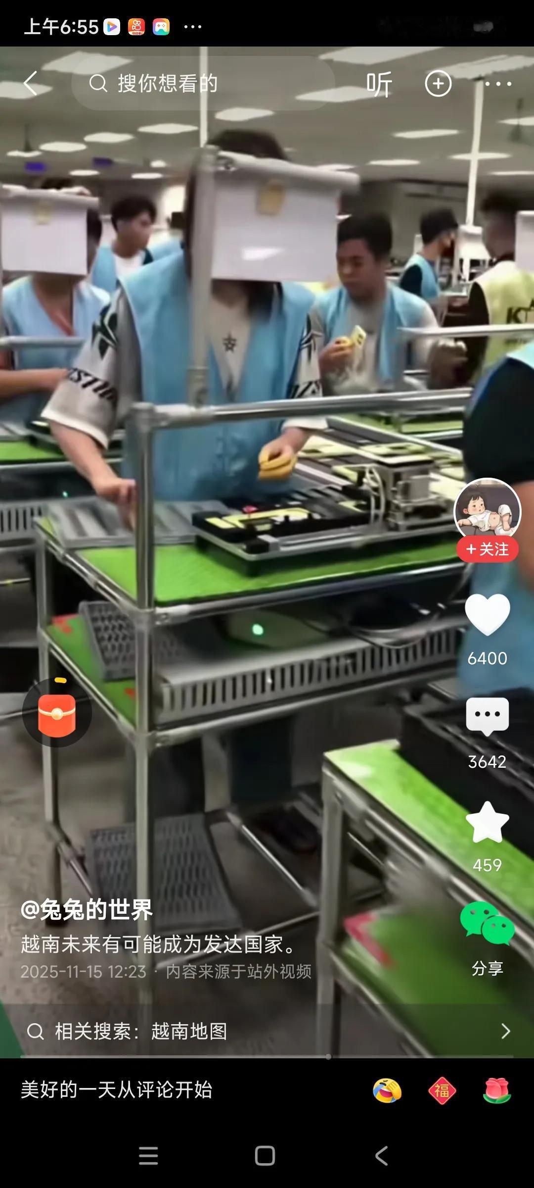 觉得越南发展势头不错,几个大国争相投资,韩国,日本各投资几百亿美元,,有些担心,越南再过八年,十年,超过我们,,[捂脸][捂脸] 一,越南面积不大,低调,不引人注目, 二,地理位置好,出口方便, 三,劳动力素质高,年轻人多, 但是又觉得不太可能,美国,日本,韩国在越南投资,只是组装,附加值低,只是低端行业,辛苦又挣得钱不多,,[捂脸][捂脸] 你看图片,越南工人站着七八个小时,不停工作,劳动强度大,只能是年轻,才吃得消,我2002年,也在电子厂干过。我们当时是有椅子坐的,车间空间大,工作环境比现在的越南要好,越南现在处于起步队阶段,他唯一的优势,不引人注目,无论美,俄,都在拉扰他,,咱们曾经无偿援助几百亿元,这个国家城府很深,,[捂脸][捂脸]