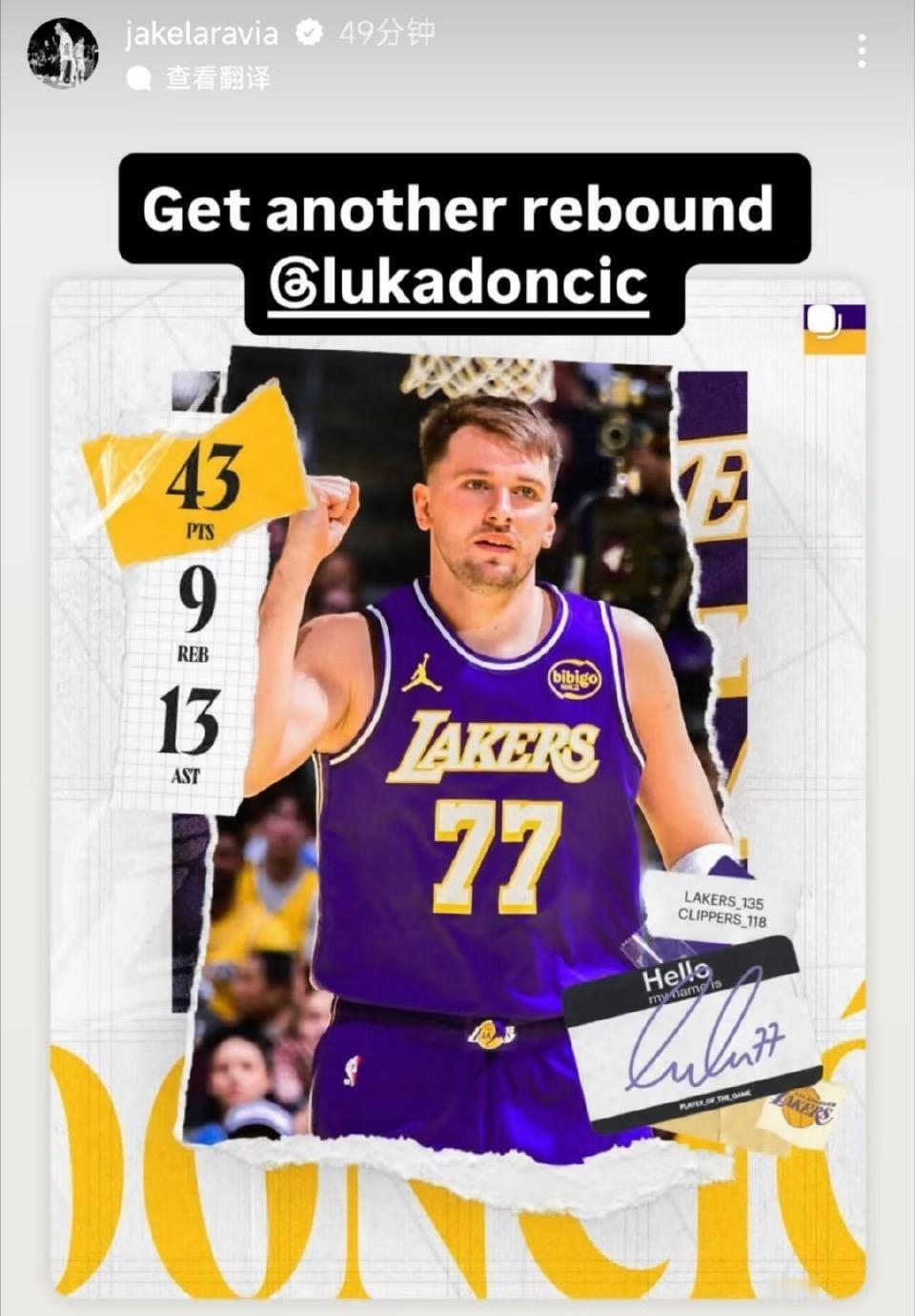 拉拉维亚在社媒上转发东契奇本场数据,调侃道“你咋不多抢一个篮板呢?” 东契奇回复道:“话密了哦哥们。”😂 东契奇本场得到43分9板13助,差一个篮板即可达成三双👌🏻井湖人战胜快船井