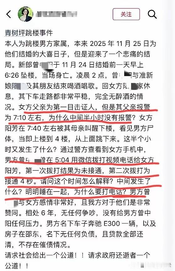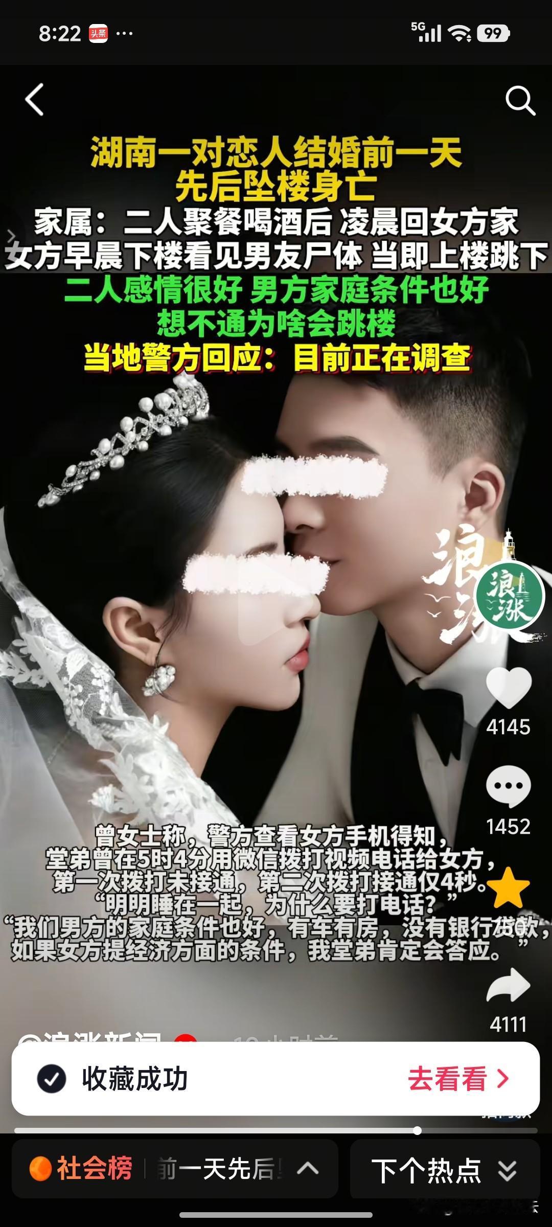 湖南跳楼的准新郎的堂姐说,警方给出的结果是她弟弟醉酒后上厕所,把窗户当厕所,不小心坠楼了。女方看到男方的尸体后也跳楼。 姐姐说她们家属不认可这个结果。弟弟当晚确实喝酒了,但是看监控里,弟弟走路什么的都很好,不像醉酒的样子。还有让她们家属不能理解的是,为什么弟弟坠楼后,女方父亲是第一个目击者,却没有马上报警,等半个小时后才报警。 还有当晚弟弟和女孩是住在一起,却给女孩打了两个电话,第一个没打通。第二个通话4秒,他们说了什么。这个跟弟弟跳楼有关系吗? 有人传言是因为彩礼,被男方姐姐否认,姐姐说她弟弟家庭条件不错,自己还经营了几家早餐店,经济条件很不错。再说两人关系很好,双方家庭也认可,弟弟也给过彩礼了,因为彩礼起矛盾可能性很小。 这就奇怪了,一个25岁的年轻人,事业有成,娶了心爱的姑娘,这不是最圆满的结局吗?如果不是意外,我真是想不出男孩为什么要跳楼了?我们还是等待警方的后续调查吧! 希望两个年轻人一路走好![祈祷][祈祷][祈祷][祈祷][祈祷][祈祷]