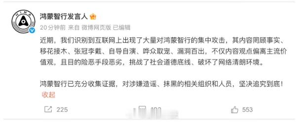 【鸿蒙智行称遭网上大量集中攻击,将坚决追究到底】今天上午,官方微博发布公告:近期识别到互联网上出现了大量对鸿蒙智行的集中攻击,其内容罔顾事实、移花接木、张冠李戴、自导自演、哗众取众、漏洞百出,不仅内容观点偏离主流价值观,且目的险恶手段恶劣,挑战了社会道德底线、破坏了网络清朗环境。鸿蒙智行方面称已充分收集证据,并对涉嫌造谣、抹黑的相关组织和人员坚决追究到底。