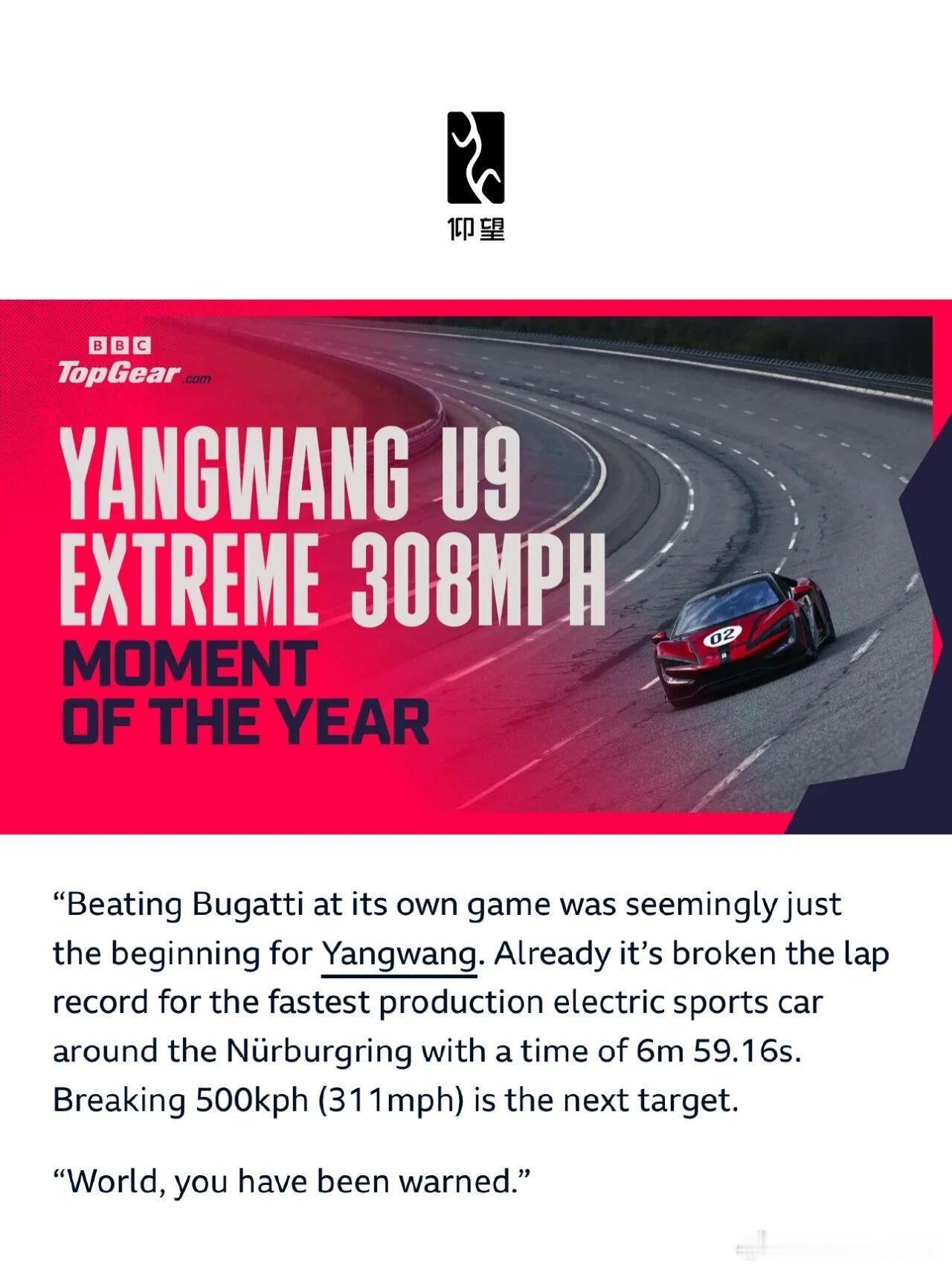 Top Gear将仰望U9X创造的496.22km/h极速评选为“年度时刻”,评价“让燃油引擎车型黯然失色”,中国汽车的高光时刻仰望u9x大v聊车超跑