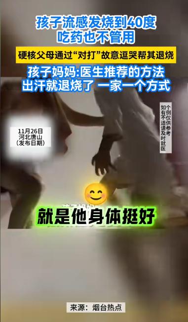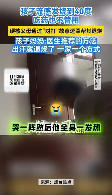 太有头脑了!11月26日,河北一孩子发烧到40度,吃药不管用,不料,爸爸竟然故意惹孩子生气,然后假装和儿子对打,孩子打不赢,委屈得不行,被打得崩溃大哭!没想到看到孩子哭了,爸爸却笑了,妈妈也不帮忙,妈妈透露:这是医生推荐的方法,出汗就退烧了 ,一家一个方式! 事发当天晚上九点多,河北的一户人家中,孩子裹着厚被子缩在沙发里,脸蛋红得发亮,妈妈拿着额温枪上面显示 40.1℃。退烧药已经喂下去半个钟头,孩子不仅没降温,还发起了寒颤,连说话的劲儿都快没了。 妈妈在客厅急得来回走,刚摸起手机要叫救护车,旁边闷头抽烟的爸爸突然掐了烟。他把烟头摁灭在烟灰缸,蹲到孩子跟前,伸手轻轻拽了拽孩子的衣角:“你这蔫蔫的样子,敢不敢起来跟我‘过两招’?” 孩子本来昏昏沉沉,被这么一拽瞬间炸了毛 —— 平时爸爸最疼他,今天怎么这么不讲理?他咬着牙撑起身子,抓起沙发上的抱枕就往爸爸身上砸:“我都难受死了,你烦不烦啊!” 爸爸故意把抱枕挡开,还轻轻拍了下他的胳膊:“就这点劲儿?还不如幼儿园小孩呢。” 这话彻底戳中了孩子的脾气。他光着脚跳下来,攥着拳头往爸爸腿上捶,可没打两下就喘得厉害,腿一软差点栽倒。爸爸 “得寸进尺”,伸手挠了挠他的胳肢窝,孩子又气又痒,眼泪 “唰” 地涌出来:“你凭什么欺负我!我都发烧了!” 看着孩子哭得肩膀一抽一抽,妈妈刚要拦,却见爸爸递来一个眼神。没两分钟,孩子的额头渗出细密的汗,头发梢都湿了。 爸爸这才笑着把他抱回沙发,拿毛巾擦着孩子的汗:“这就对了,你妈说医生早说了,高烧不退的时候出透汗,比吃药来得快。我不激你,你哪有力气动?” 妈妈端着温水走过来,无奈又好笑地戳了下爸爸的胳膊:“你这招也太‘损’了,孩子刚才都快急哭了。” 等孩子喝完水躺平,再测体温已经降到 38.2℃,虽然没完全正常,但精神头明显好了不少,还能嘟囔着抱怨 “爸爸耍赖”。 妈妈拍着孩子的背,想起下午给儿科医生打电话时,对方说 “高烧不退别光盯着药,让孩子适度活动出点汗,情绪波动也能促进循环”,这才明白爸爸哪是 “瞎闹”,是早把医生的话记在了心里。 这事被妈妈发在小区群里,没半天就传开了。有网友笑称 “这爹是‘反向带娃’天花板,别人哄孩子,他‘逗’孩子。” 还有宝妈说 “我家娃上次烧到 39 度,我让他跳了十分钟绳,出完汗真退了,原来不是我一个人这么干”;也有人担心:“万一孩子情绪太激动怎么办?” 不过更多人觉得,“只要能退烧、孩子没真受伤,这种‘土招’比干等着强”。 其实当天晚上,爸爸蹲在阳台给医生发消息:“大夫,孩子出汗了,体温降了,谢谢您的办法。” 对方回得快:“每个孩子体质不一样,你们能找准他的‘情绪开关’,比啥都强。” 后来孩子退烧后跟同学炫耀:“我爸可厉害了,用‘打架’给我治好了发烧!” 没人知道,那天爸爸攥着孩子拳头的时候,手心里全是汗 —— 他哪是不怕,只是知道,有时候 “让孩子‘动一动’,比干着急有用多了”。 就像网友说的:“当爸妈的哪有什么‘奇招’,不过是把医生的话拆成孩子能接受的样子,哪怕看起来有点‘离谱’,藏的都是慌里慌张的爱。” 你家娃发烧时,有没有过什么 “不按常理出牌” 的退烧招?欢迎在评论区留下你的看法!