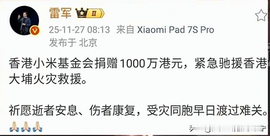 雷老板第一时间便捐了1000万港元。这响应速度是真快呀![赞]