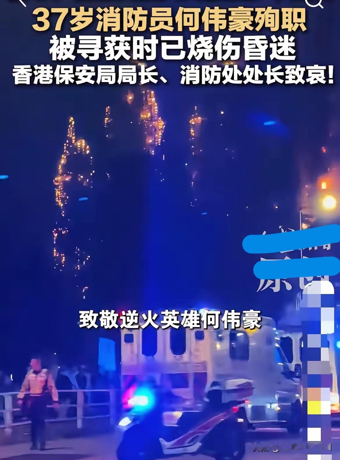 就在刚刚 逆火而行的凡人英雄[赞][赞][赞] 香港大埔大火中,37岁消防员的殉职让无数人揪心。三小时内,火势从三级疯长至五级,竹棚燃烧的噼啪声里,他与队友扛着水枪义无反顾冲进火海。前一秒还在与死神竞速救人,后一秒便永远定格在救援路上。 世间从无天生英雄,不过是普通人在危难时选择挺身而出。37岁的他,用凡人之躯扛起生命重量,把生的希望留给他人。向这位逆行勇士致敬,愿一路走好,也盼大火早日扑灭,所有救援人员平安归来。