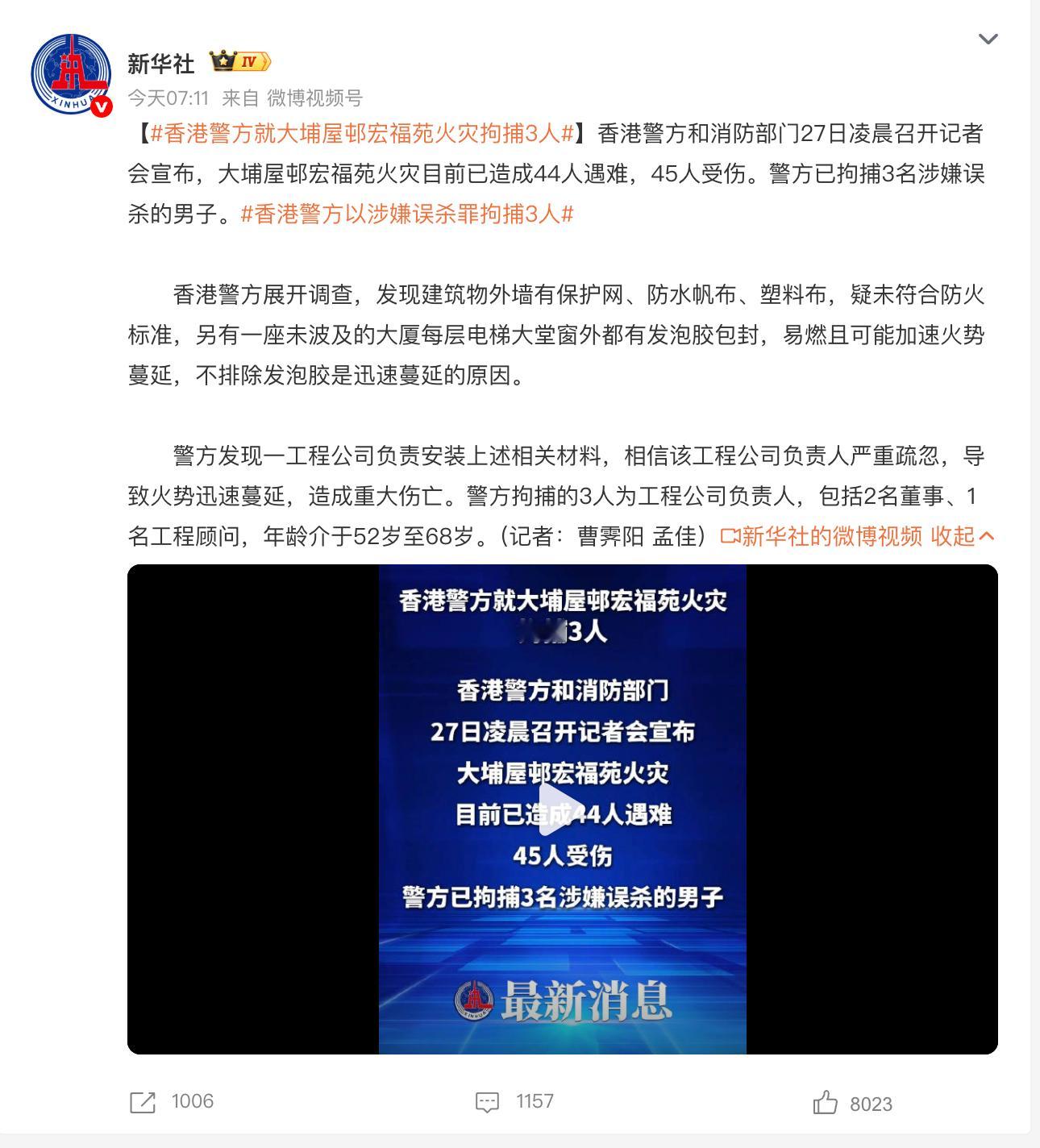 香港火灾已致44人遇难,目前警方已经拘捕3名涉嫌误杀的男子,包括2名董事、1名工程顾问,年龄介于52岁至68岁。香港警方以涉嫌误杀罪拘捕3人