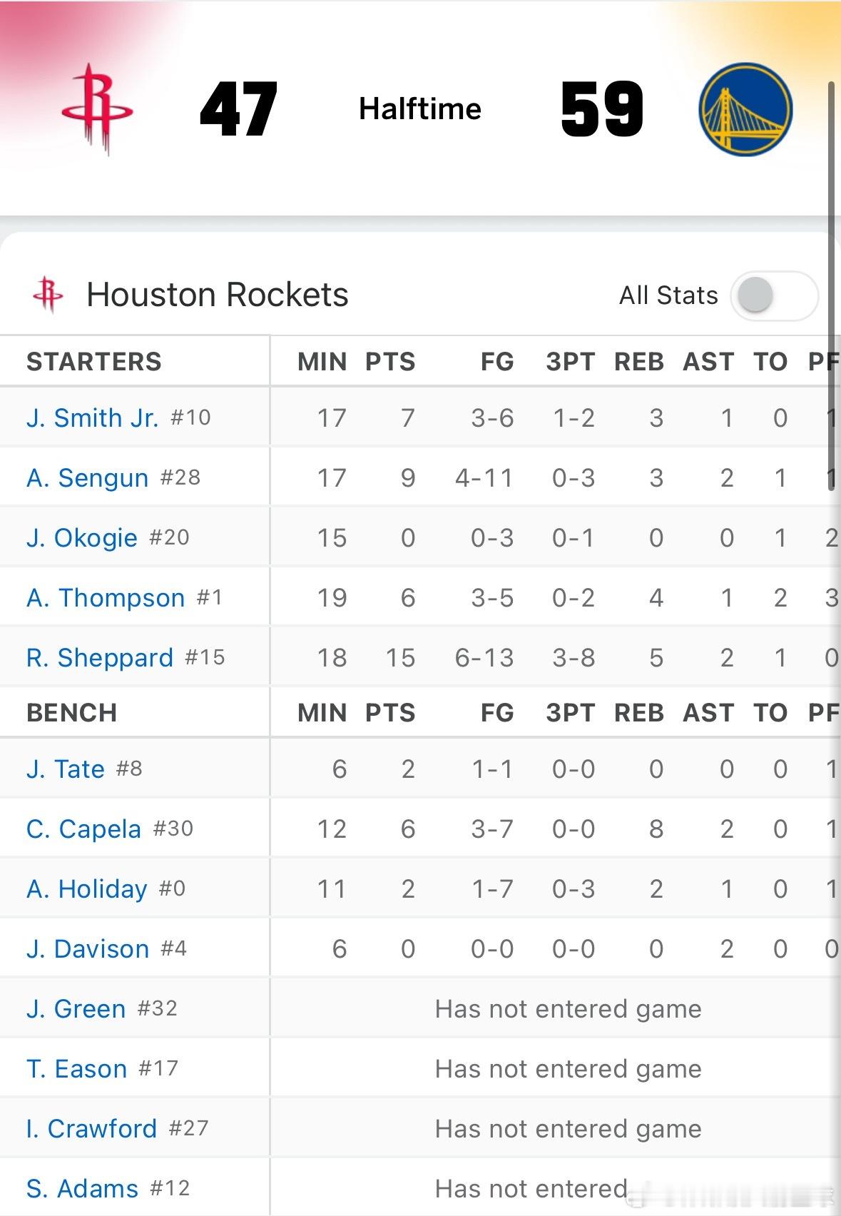 半场结束,火箭47比59落后!!!!上半场火箭三分球19投仅命中4球(3个来自谢泼德)。谢泼德半场15分5篮板,卡佩拉6分8篮板(6前场)🔥火箭vs勇士休斯顿火箭休斯顿火箭