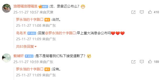 罗永浩:录音会公布的。 罗永浩今天发文,但是并没有公布网友关注的录音。 不过评论区还有有看点的。 有网友评论:龙,录音还公布么?[大笑]罗永浩回复两个字:当然。干脆利落。说明还有瓜可吃。 还有网友评论:是不是背着我们私下接受道歉了?[抠鼻]罗永浩表示没有。 昨天发生那么大的事,罗老师显然是不想占用公共资源,广大网友需耐心等待下。