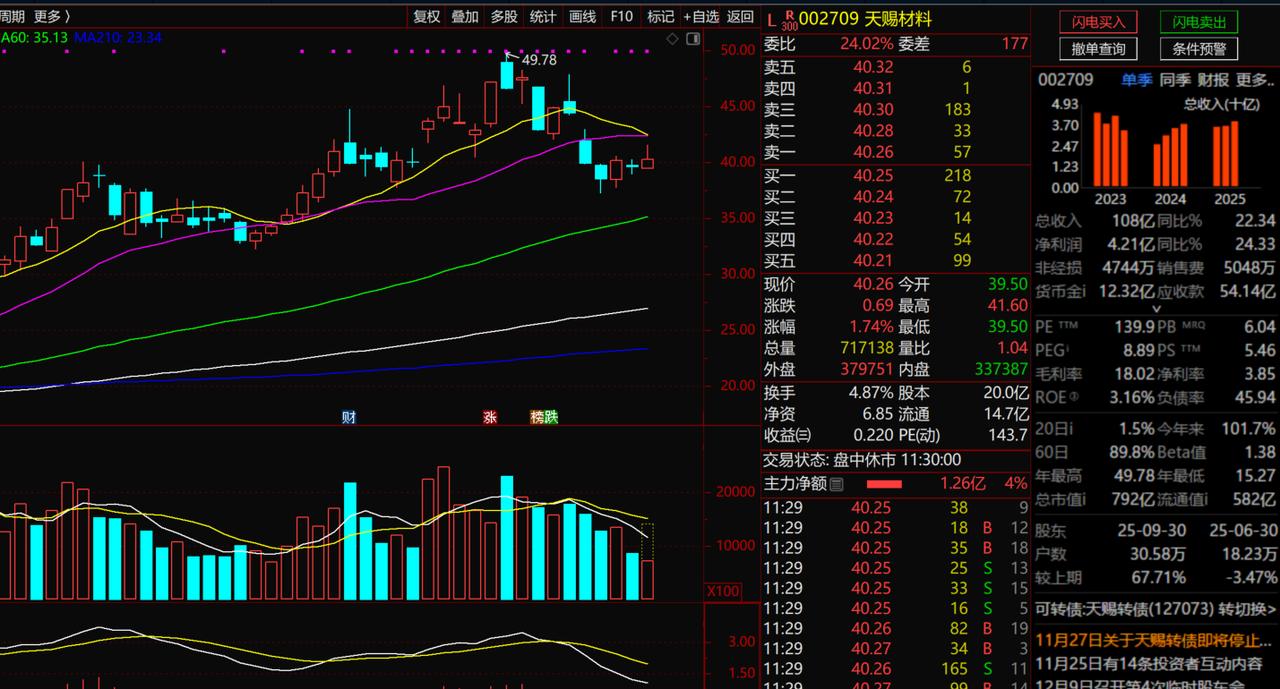 天赐材料 1、技术面:股价从8月下旬20元左右,前几天的股价高点已经接近50元,在这一轮电池材料涨价利好消息的刺激下,股价出现大幅度的上涨。但是这个一个多礼拜股价明显的出现回落,从高点的49.78元回落到低点,37.26元明显的出现回落。目前股价有反弹的迹象,但这个位置可能仅仅只是反弹,能否继续创出前面的新高。目前还没有积极的现象。制约股价未来能否继续保持大涨,那要看。电池材料六氟磷酸锂以及vc的价格能否会持续保持上行?但是这种工业品涨价,应该是有时时间周期的,也就是说产能一旦上来之后,涨价因素可能就没有了。 2、从基本面的情况来看,很显然前期股价上涨和基本面有明显的背离现象,今年前三个季度公司的利润只有4.2亿,同比增长24%。应收账款高达54亿元,货币资金只有12亿元,目前对应的动态市盈率高达139.9倍。毛利率18%,净利率只有3.8%。 我们进一步从机构对它的业绩预测可以看出今年的利润大概在12个亿明年三十三亿二零27年可能会达到48亿元,当然这只是其中一家机构给它的业绩预测能否达到。还要进一步的观察,那么当前对应的市值是800亿元,显然对于2027年的利润来看,市盈率不足20倍。股价能否继续上涨,就看利润的兑现能否实现。 关注牛小伍
