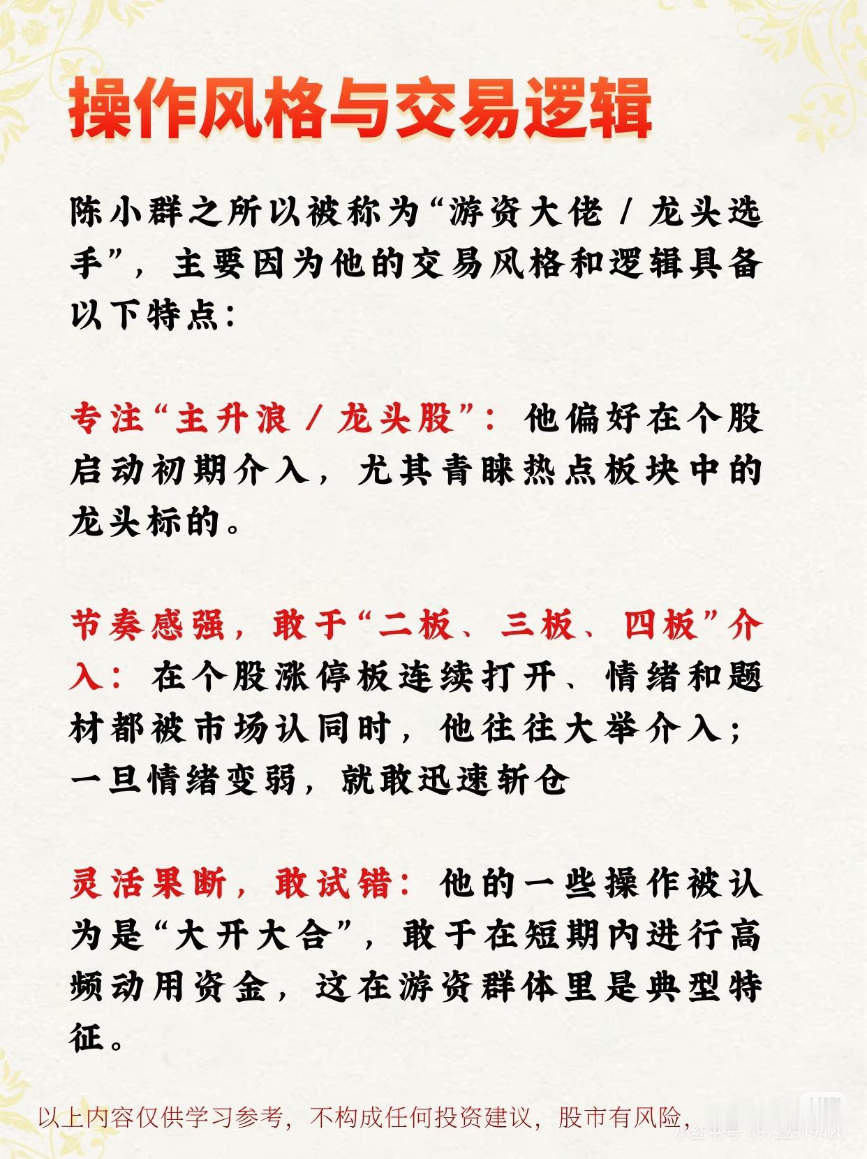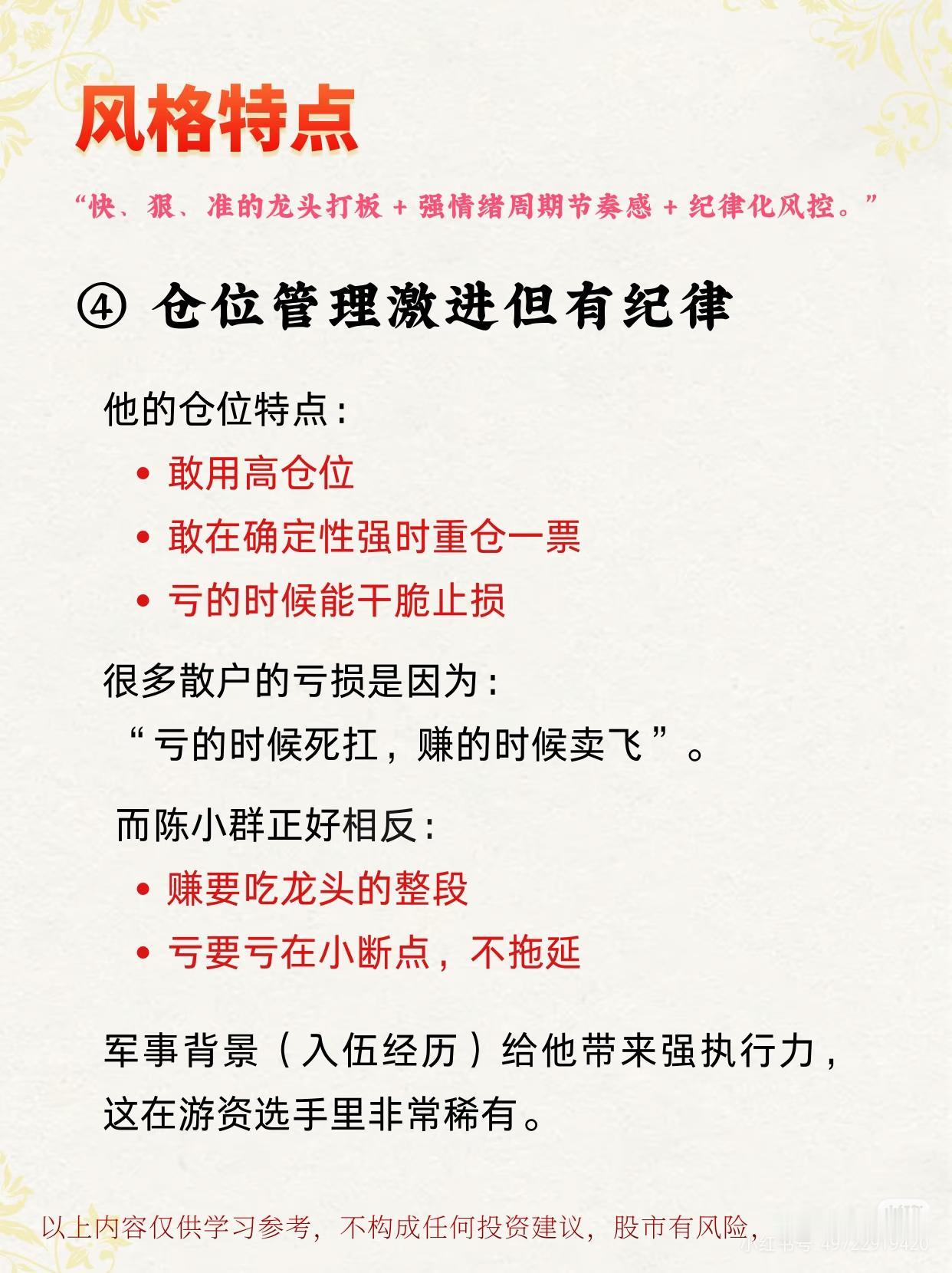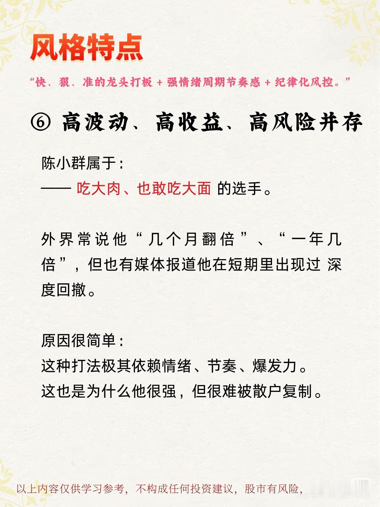 陈小群(原名陈宴群),1995年出生,是中国A股市场新生代游资代表,俗称“心跳大神”,擅长操作涨停板、主升浪,节奏快且出手果断。他大学期间接触股票,2012-2013年学习基础知识,大学二年级休学入伍两年,军旅生涯锻炼的纪律性成为其后期交易风格的重要基础。 其交易风格与逻辑特点鲜明,因此被称为“游资大佬/龙头选手”:专注“主升浪/龙头股”,偏好在个股启动初期介入,尤其青睐热点板块中的龙头标的;节奏感强,敢于在个股涨停板连续打开(二板、三板、四板)、情绪和题材被市场认同时大举介入,情绪变弱则迅速斩仓;灵活果断,敢试错,短期内高频动用资金,操作“大开大合”,是游资群体典型特征。 具体风格可概括为“快、狠、准的龙头打板 + 强情绪周期节奏感 + 纪律化风控”,包含六大核心特点: 1. 主打「龙头战法」:几乎不做“补涨股”,聚焦板块里最先涨停、成交量和换手率最强、资金合力最明显的“第一梯队”,坚持“只做龙头,不做跟风”。此逻辑下,龙头强则赚钱效应爆棚,龙头弱则市场退潮,是高胜率选手的典型策略。 2. 情绪交易:懂得踩市场节奏:作为典型的“情绪周期交易者”,对市场情绪极度敏感——情绪启动期提前潜伏或首板参与,高潮期加速打板(2板-4板),分歧期高换手参与或大幅做T,退潮期果断空仓,精准与市场节奏同步,避免散户“退潮追高、高潮卖飞”的反向操作。 3. 超强打板能力:快、狠、节奏准:成名标签为打板速度快、判断准、敢重仓,擅长连板股、龙头加速板及情绪一致的强势涨停。强势行情中,敢在板未封死前提前抢板、板打开时回落低吸,板封不住时及时撤退,体现职业级“敢上、敢撤、有计划”的特征,不盲目跟随情绪。 4. 仓位管理激进但有纪律:敢用高仓位,确定性强时重仓单一标的,亏损时果断止损。区别于散户“亏时死扛、赚时卖飞”的常见问题,他坚持“赚吃龙头整段、亏在小断点”,军旅背景赋予的强执行力使其在执行层面更显优势。 5. 题材嗅觉敏锐:市场热点启动时,常为最快介入者之一。关注方向涵盖科技(AI、机器人)、新能源(锂电、储能)、消费电子及新兴题材(数字金融、算力、光模块等),一旦确定方向便大笔直冲龙头。 6. 高波动、高收益、高风险并存:属于“吃大肉、也敢吃大面”的选手,外界传其“几个月翻倍”“一年几倍”,但也有短期深度回撤的报道。此模式高度依赖情绪、节奏与爆发力,虽实力强劲却难以被散户复制。 需注意,以上内容仅供学习参考,不构成任何投资建议,股市有风险,投资需谨慎。