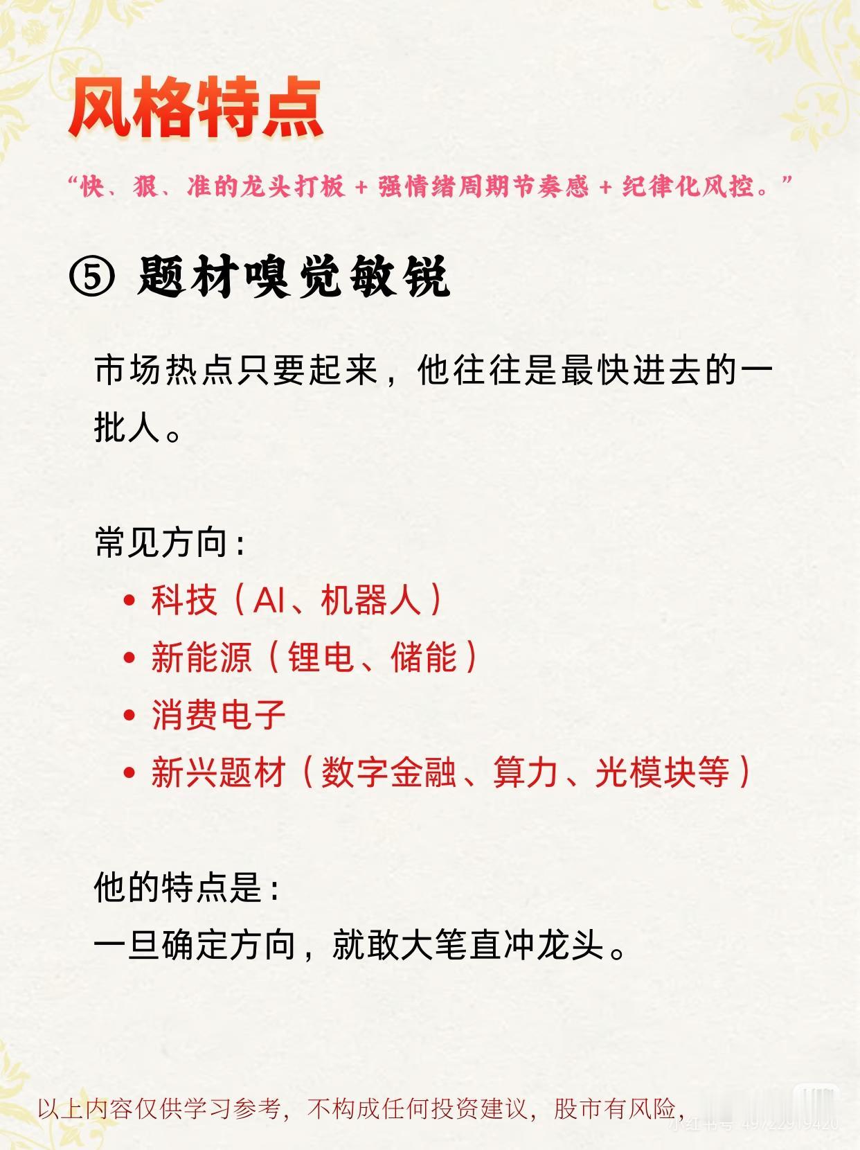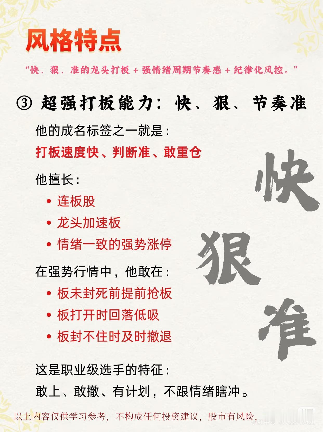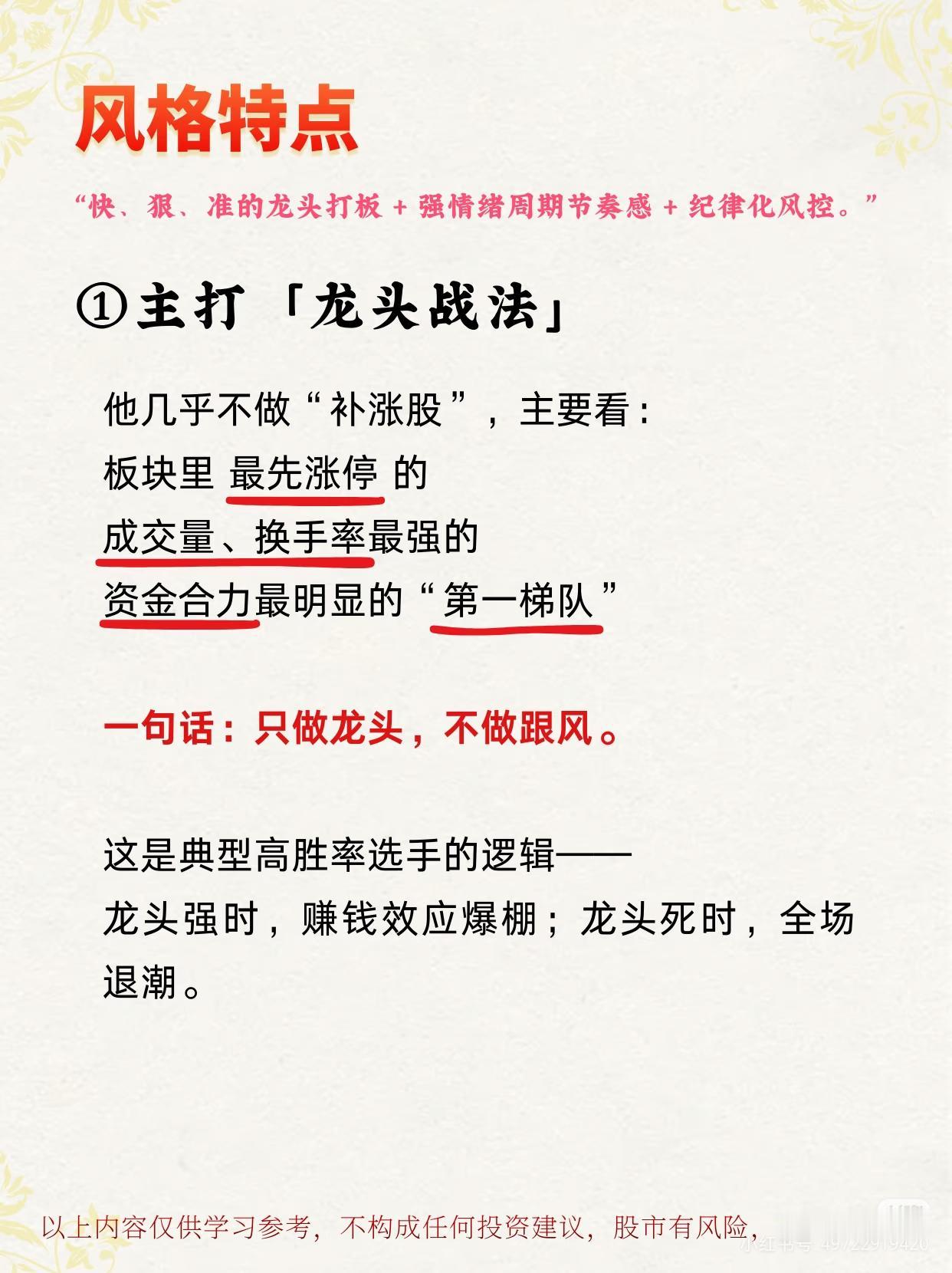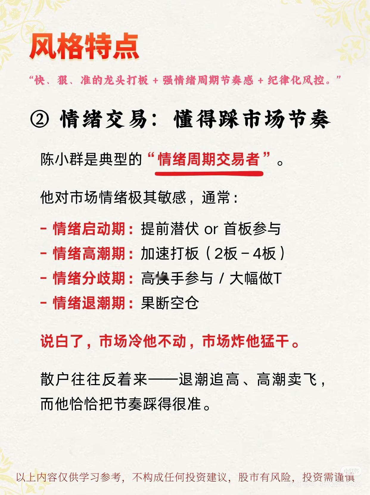 陈小群(原名陈宴群),1995年出生,是中国A股市场新生代游资代表,俗称“心跳大神”,擅长操作涨停板、主升浪,节奏快且出手果断。他大学期间接触股票,2012-2013年学习基础知识,大学二年级休学入伍两年,军旅生涯锻炼的纪律性成为其后期交易风格的重要基础。 其交易风格与逻辑特点鲜明,因此被称为“游资大佬/龙头选手”:专注“主升浪/龙头股”,偏好在个股启动初期介入,尤其青睐热点板块中的龙头标的;节奏感强,敢于在个股涨停板连续打开(二板、三板、四板)、情绪和题材被市场认同时大举介入,情绪变弱则迅速斩仓;灵活果断,敢试错,短期内高频动用资金,操作“大开大合”,是游资群体典型特征。 具体风格可概括为“快、狠、准的龙头打板 + 强情绪周期节奏感 + 纪律化风控”,包含六大核心特点: 1. 主打「龙头战法」:几乎不做“补涨股”,聚焦板块里最先涨停、成交量和换手率最强、资金合力最明显的“第一梯队”,坚持“只做龙头,不做跟风”。此逻辑下,龙头强则赚钱效应爆棚,龙头弱则市场退潮,是高胜率选手的典型策略。 2. 情绪交易:懂得踩市场节奏:作为典型的“情绪周期交易者”,对市场情绪极度敏感——情绪启动期提前潜伏或首板参与,高潮期加速打板(2板-4板),分歧期高换手参与或大幅做T,退潮期果断空仓,精准与市场节奏同步,避免散户“退潮追高、高潮卖飞”的反向操作。 3. 超强打板能力:快、狠、节奏准:成名标签为打板速度快、判断准、敢重仓,擅长连板股、龙头加速板及情绪一致的强势涨停。强势行情中,敢在板未封死前提前抢板、板打开时回落低吸,板封不住时及时撤退,体现职业级“敢上、敢撤、有计划”的特征,不盲目跟随情绪。 4. 仓位管理激进但有纪律:敢用高仓位,确定性强时重仓单一标的,亏损时果断止损。区别于散户“亏时死扛、赚时卖飞”的常见问题,他坚持“赚吃龙头整段、亏在小断点”,军旅背景赋予的强执行力使其在执行层面更显优势。 5. 题材嗅觉敏锐:市场热点启动时,常为最快介入者之一。关注方向涵盖科技(AI、机器人)、新能源(锂电、储能)、消费电子及新兴题材(数字金融、算力、光模块等),一旦确定方向便大笔直冲龙头。 6. 高波动、高收益、高风险并存:属于“吃大肉、也敢吃大面”的选手,外界传其“几个月翻倍”“一年几倍”,但也有短期深度回撤的报道。此模式高度依赖情绪、节奏与爆发力,虽实力强劲却难以被散户复制。 需注意,以上内容仅供学习参考,不构成任何投资建议,股市有风险,投资需谨慎。
