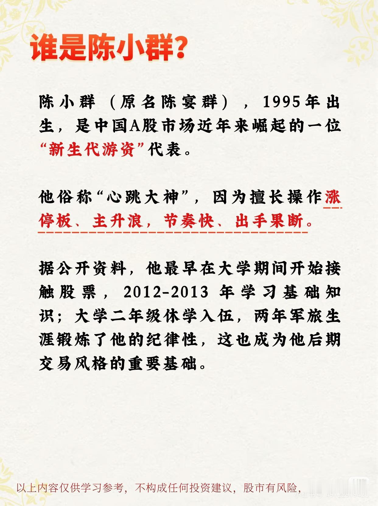 陈小群(原名陈宴群),1995年出生,是中国A股市场新生代游资代表,俗称“心跳大