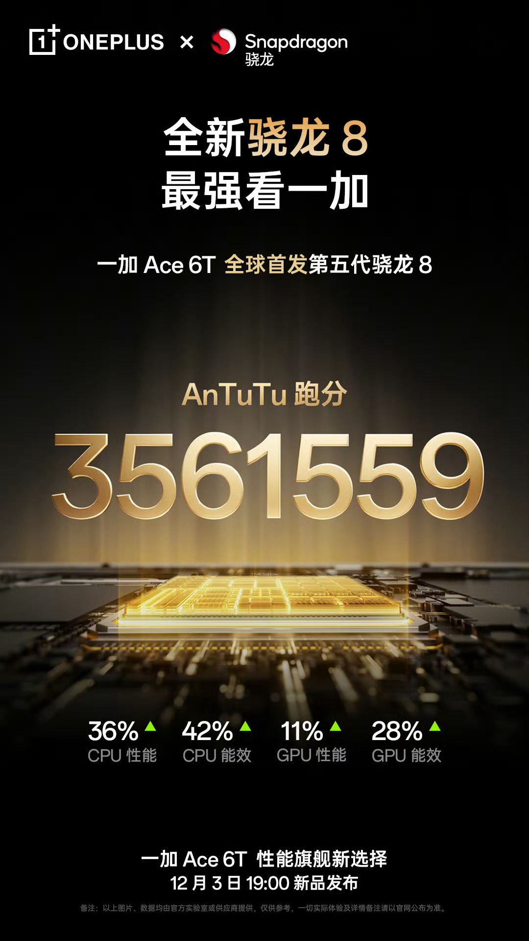 一加Ace6T官宣定档12月3日第五代骁龙8+165Hz超高刷+8000mAh大
