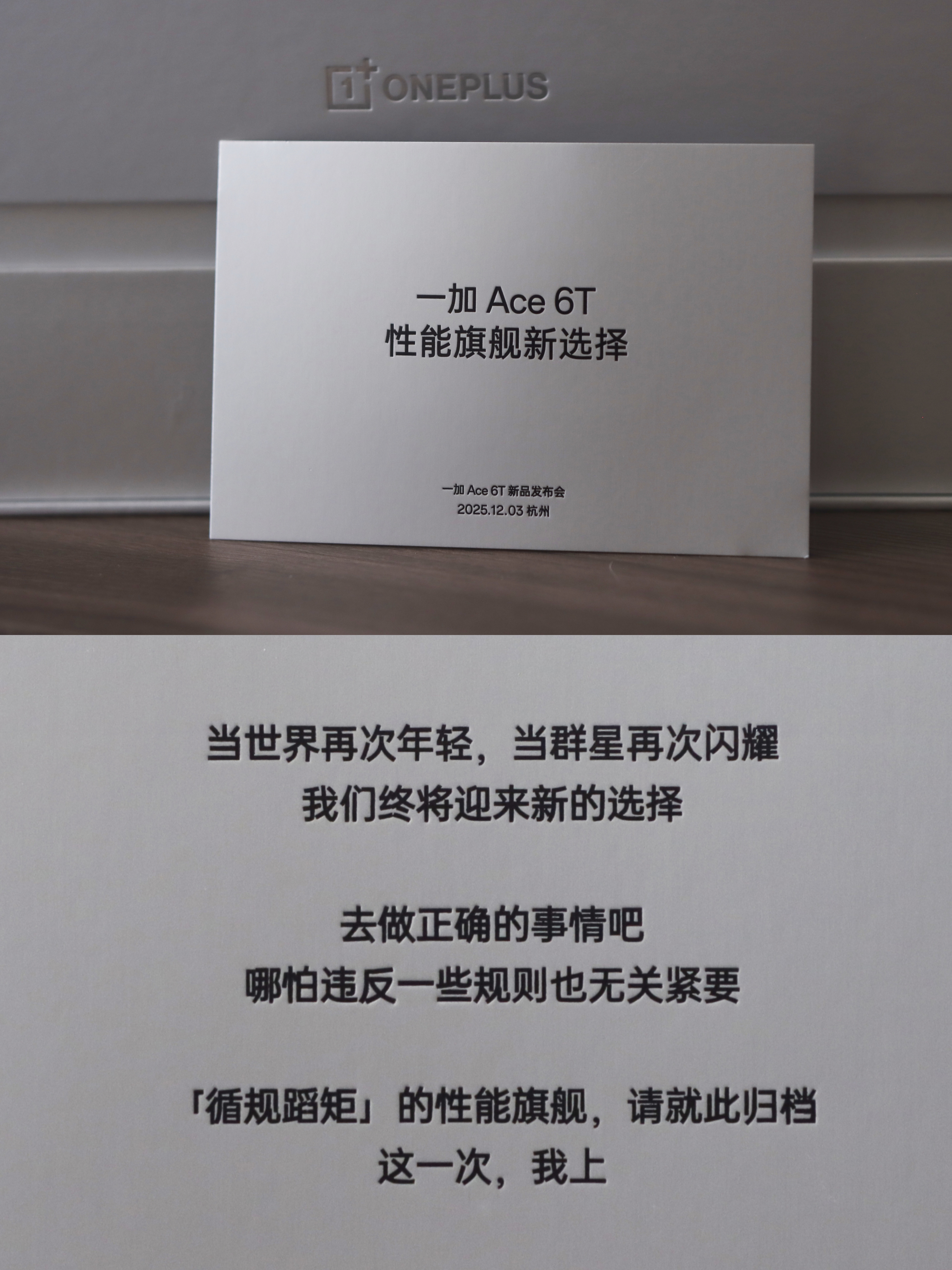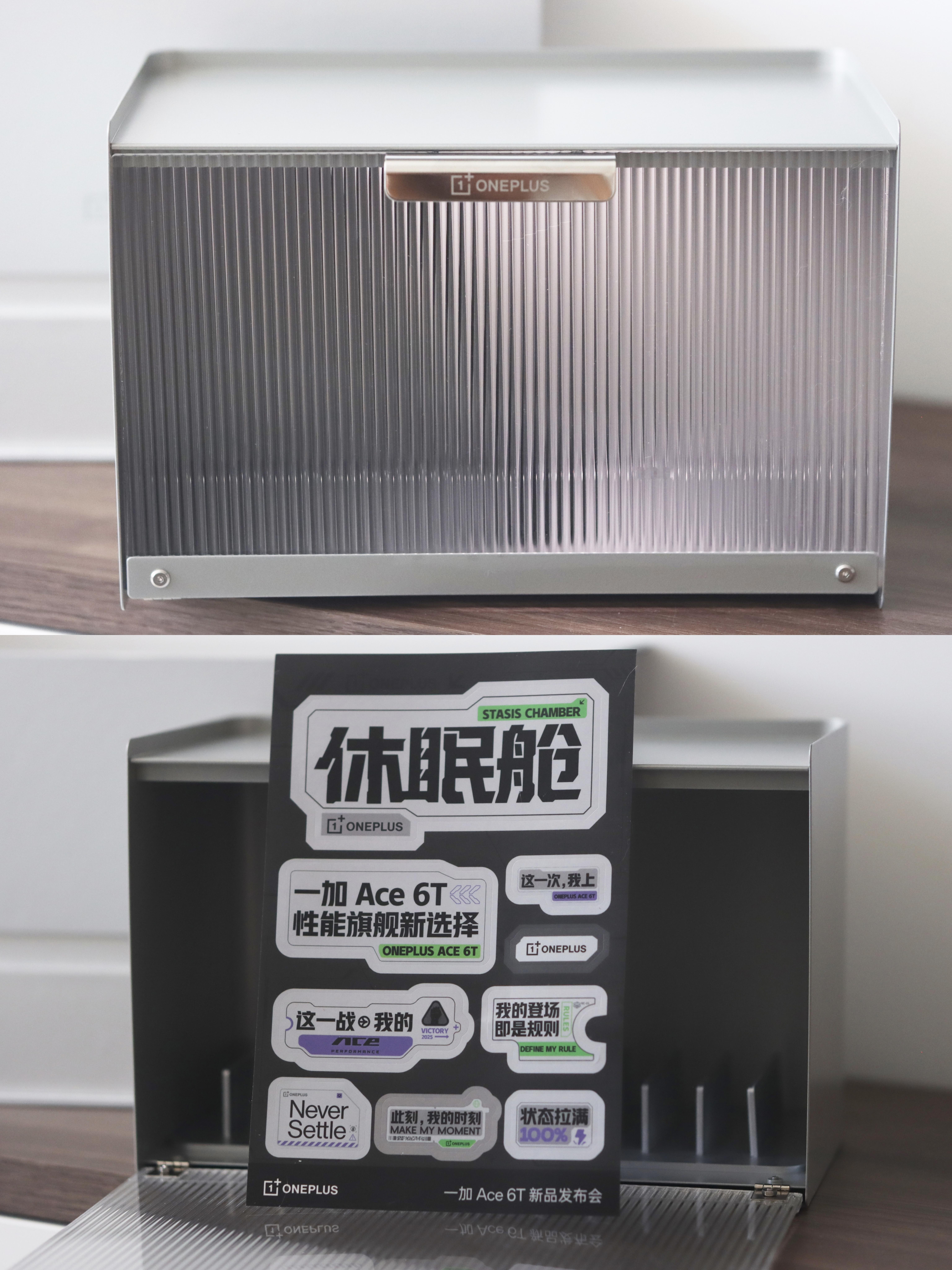 一加Ae6T发布会邀请函,没想到这次安排了个「手机休眠仓」,整体设计的很精致,透明栅格化的玻璃门+银色金属的外壳,而且还贴心附送了感光灯,增加手机在太空休眠仓中展示时的氛围感。这次的特殊的邀请函寓意也很明显,预示着从一加 Ace6T 开始,手机将进入性能+续航赛道的新时代,至于其他的“旧手机”就让它们在太空舱好好休息吧~一加Ace6T 12.3,杭州见!