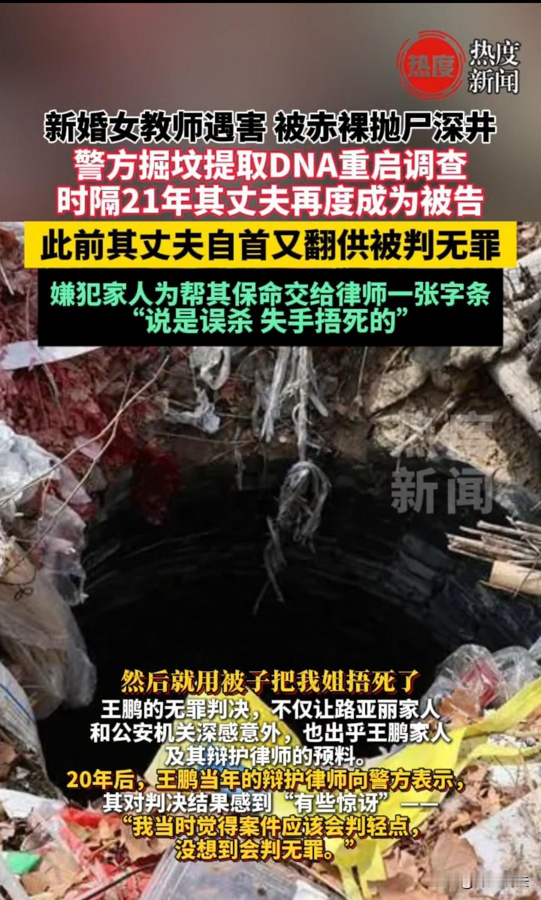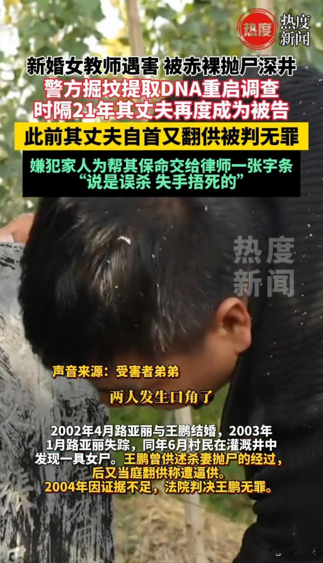 山西,时隔16年,民警再度挖掘女子坟墓,提取残骸完成DNA鉴定,最终锁定死者正是失踪17年的山西乡村女教师路亚丽。随着这一关键证据的出炉,一桩尘封21年的命案终于有了突破性进展,女子婚后惨遭丈夫王鹏家暴、最终被谋害抛尸的悲惨真相,也渐渐浮出水面。 女子路亚丽曾满心期待地与丈夫王鹏结婚,可婚前那个温文尔雅的丈夫,婚后却越发暴躁易怒。路亚丽一度怀疑,是不是当初自己选错了人。 两人的矛盾从最初的争执,逐渐升级为肢体冲突。王鹏从最开始犯错后求情、求复合、求原谅,慢慢变得肆无忌惮,完全不顾及路亚丽的感受,轻则言语辱骂、推搡,重则直接殴打。 2003年1月3日,两人再次发生激烈矛盾,在房间里大吵起来,随后路亚丽就没了声音。第二天,路亚丽没有按时出现,学校同事发现后,连忙询问她的丈夫王鹏。王鹏却异常淡定地说,路亚丽回娘家了,有急事要处理。 由于当时通讯不便,没有手机,也没有便捷的联系方式,同事和乡亲们无法核实情况,只能暂时作罢。 2003年6月19日,有村民在灌溉井里发现一具尸体。警方到达现场后,通过尸体的身高、衣着、体貌等基础特征,初步判断死者就是路亚丽,随即依法将其丈夫王鹏抓捕归案。 2003年10月,运城市检察院经审查,以故意杀人罪对王鹏提起公诉,案件进入审判阶段。可庭审中,王鹏拒不认罪,还与家属互通消息,让家属帮忙隐瞒真相、作伪证,试图逃避法律制裁。 即便检察院依法提起公诉,王鹏仍当庭翻供,否认自己的作案行为,声称此前的供述是遭受刑讯逼供所致。 2004年12月10日,法院审理后认为,该案仅靠尸体基础特征判定死者身份,缺乏科学的法律依据,且关键物证未找到、证据链不完整,最终以“证据不足”判决王鹏无罪。 之后检察院提起抗诉,但被山西省高院驳回,案件就此沉寂,路亚丽的家人始终不服判决,持续申诉,坚持追寻真相。 时隔十六年,2020年,警方重启该案侦破工作,重点弥补当年的证据短板,推进案件侦破进程。侦破期间,警方采取多项关键举措: 一是掘开路亚丽的坟墓,提取其残骸进行DNA鉴定,科学确认当年灌溉井中的尸体就是路亚丽,彻底解决了当年尸源认定无法律依据的问题; 二是重新走访当年的目击者,核实到案发时学校房外有多处血迹,当年的学生曾亲眼看到,这与王鹏最初认罪时供述的作案细节高度吻合,印证了其作案事实; 三是排查出关键书证,找到王鹏姐姐写给相关执法人员的字条,内容提及“不小心用被子捂紧了,给捂死了”,直接佐证王鹏谋害妻子的真相,同时查实王鹏家属当年协助其掩盖罪行、作伪证的事实。 随着各项新证据陆续固定,证据链逐渐完整,2024年5月,警方再次将王鹏抓捕归案,同时将协助其作伪证、妨害司法公正的家属一并逮捕。 2025年7月23日,运城市中院再次开庭审理该案,控方提交DNA鉴定报告、学生证言、王鹏姐姐的字条等新证据,明确指控王鹏谋害妻子。 目前,案件尚未作出最终判决,仍在进一步审理中,警方和法院将继续核查细节,确保案件侦破公正、判决严谨,还路亚丽及其家人一个公道。 一、2004年王鹏因“证据不足”被判无罪,核心法律依据是什么? 《刑事诉讼法》第五十五条:“对一切案件的判处都要重证据,重调查研究,不轻信口供。只有被告人供述,没有其他证据的,不能认定被告人有罪和处以刑罚;没有被告人供述,证据确实、充分的,可以认定被告人有罪和处以刑罚。证据确实、充分,应当符合以下条件: (一)定罪量刑的事实都有证据证明; (二)据以定案的证据均经法定程序查证属实; (三)综合全案证据,对所认定事实已排除合理怀疑。” 2004年案件中,尸源无DNA科学确认、关键凶器未找到,证据未达“确实、充分”标准,法院判无罪,是“疑罪从无”原则的直接体现,避免无充分证据下的错判,保障司法公正。 二、DNA鉴定、亲属字条等新证据出现后,案件为何能重启审理? 《刑事诉讼法》第二百五十三条第一项:“当事人及其法定代理人、近亲属的申诉符合下列情形之一的,人民法院应当重新审判:(一)有新的证据证明原判决、裁定认定的事实确有错误,可能影响定罪量刑的。” DNA鉴定锁定尸源、亲属字条佐证作案事实、学生证言补强细节,这些新证据足以推翻原“证据不足”的判决,符合“新证据影响定罪量刑”的再审条件,体现司法纠错的严谨性。 对于此事,大家如何看待? 素材来源于热度新闻,2025年11月26日