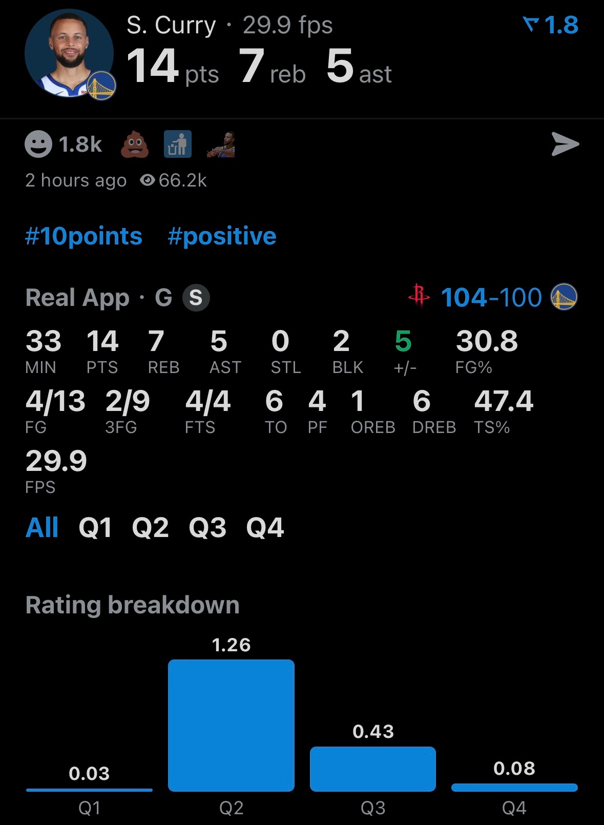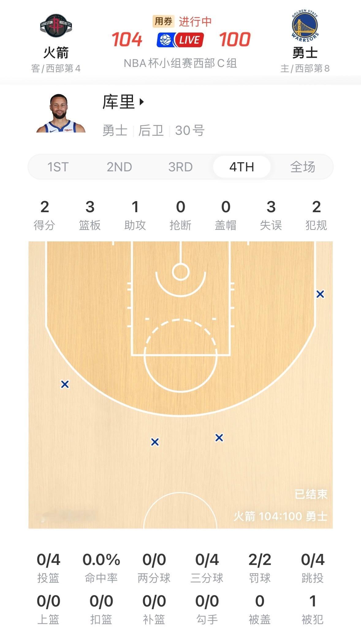 末节2分!库里出战33分钟,13投4中,三分9中2,得到14分7板5助攻6失误,正负值+5。末节三分4投0中。勇士被火箭逆转。 火箭vs勇士