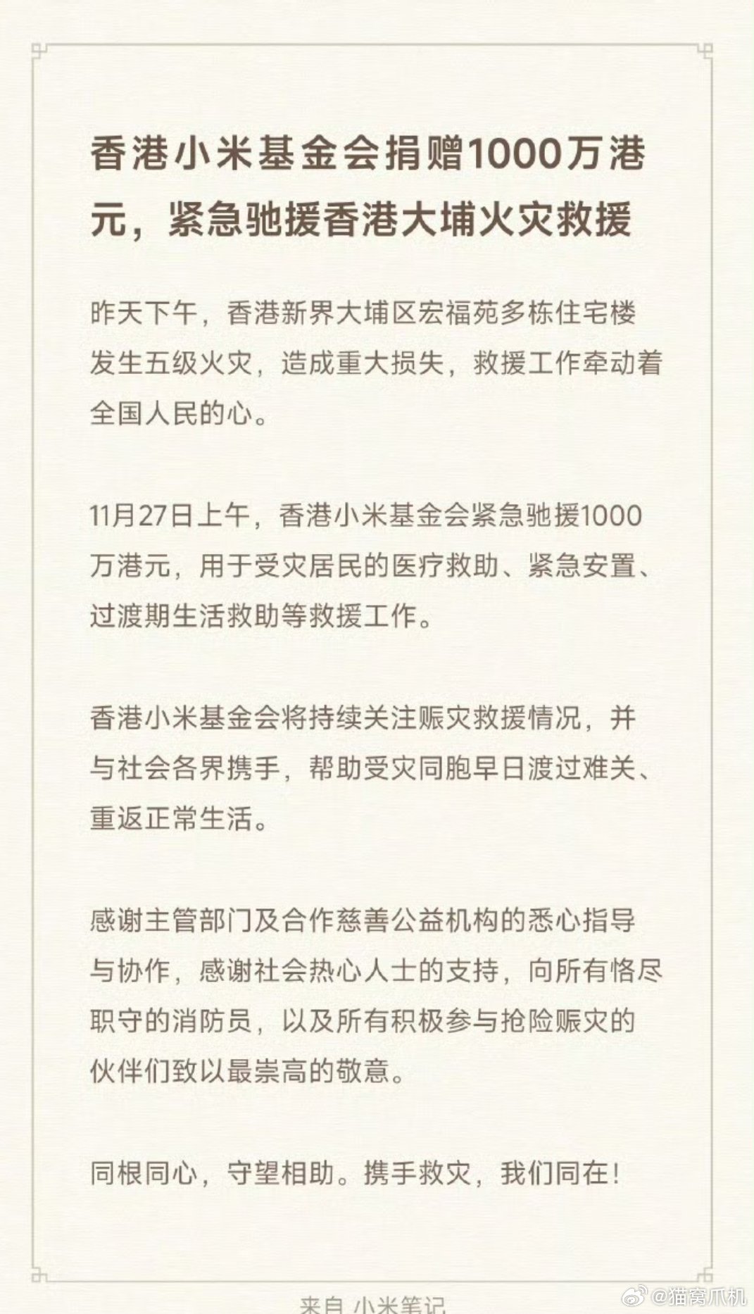 一方有难,八方支援。目前不仅仅是小米,比亚迪、腾讯、阿里、蚂蚁等企业都对受灾地区捐款,这些企业也值得让大家知道他。小米捐款驰援香港大埔火灾救援