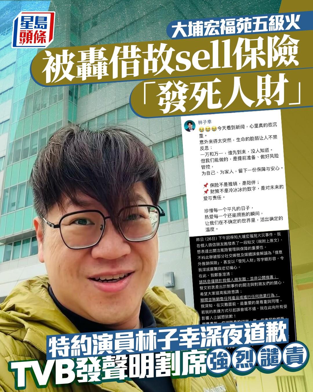 港媒消息:香港大埔宏福苑昨日(26日)发生严重的五级大火。正当大家对死伤者表达深切慰问时,前TVB特约演员被指利用事故推销保险,被网民怒轰“发死人财”,冷血行为令人不齿。 TVB发出严正声明,对有关“特约演员林子幸借火灾事故推广保险”等相关言论,澄清林子幸非TVB员工,公司与林子幸并无任何关联,林子幸的行为也不代表TVB立场,并对任何利用社会重大事故或他人不幸事件作为宣传之行为予以强烈谴责。