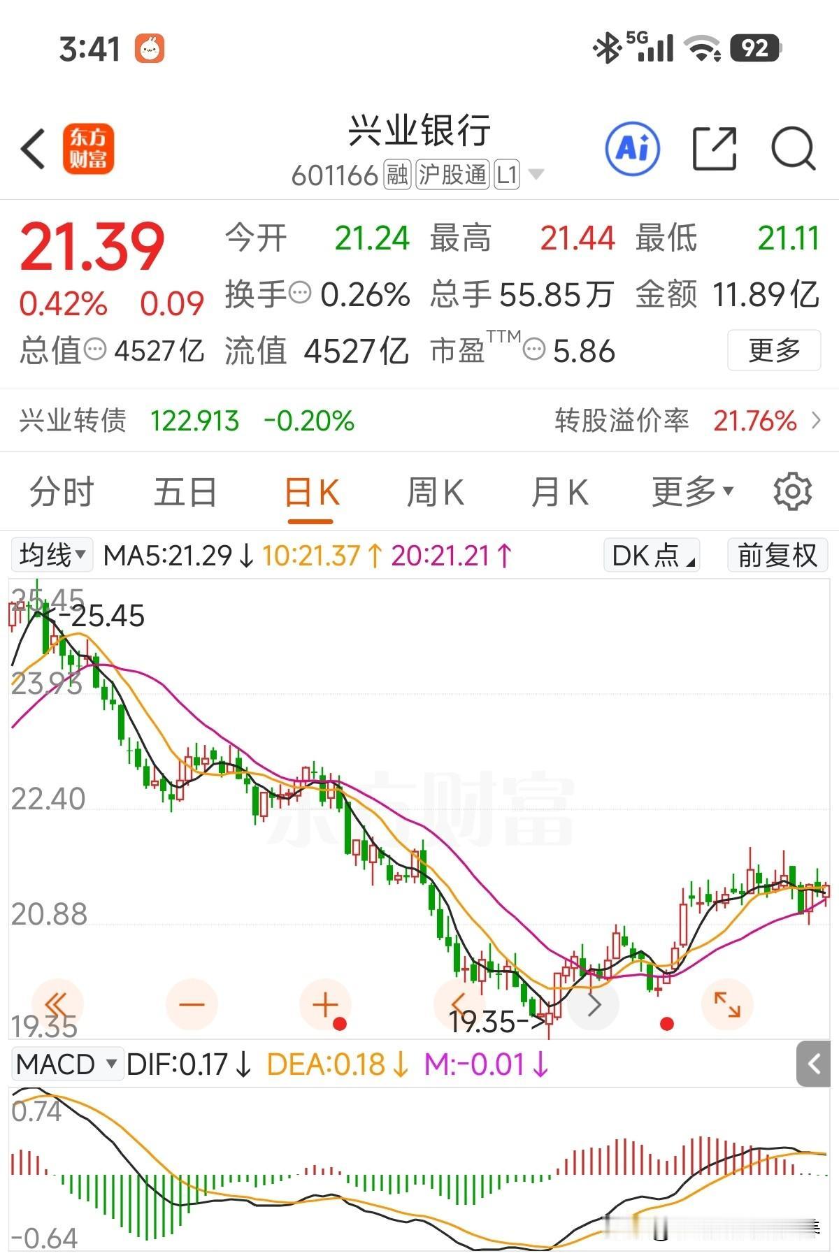 转眼又在21.4左右位置盘整了一个多月!下周该出方向了! 继续坚持转股价下方的兴业银行只会套时间,换个角度来看,即便估值没有不提升,一直保持着0.58市净率,还可以一边收到5%股息,同时享受着每年每股权益提升10%! 当然个人坚信兴业银行不可能一直在市净率不可能一直停留在0.58[呲牙],就跟坚信之前年年十八终会长大一样!