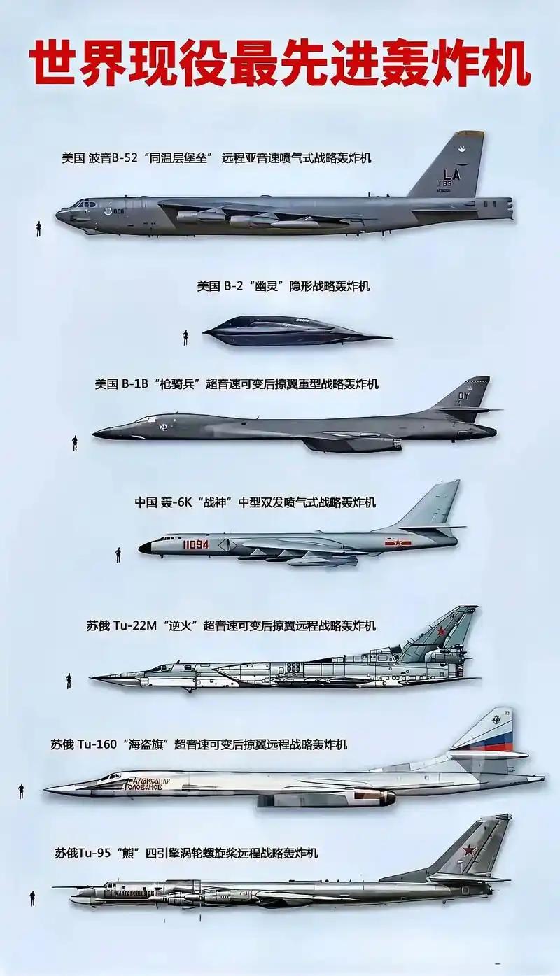 世界公布现役最先进轰炸机排行榜: (阅读前请点个赞,点个关注,主页有更多你喜欢看的内容) 前不久有媒体发布了的全球最危险轰炸机排行榜,其中中美俄三国占据了前五的席位,从后往前排依次是中国轰-6、美国B-52、俄罗斯图-95MS、美国B-2,榜首是俄罗斯图-160。 这五款机型,正好对应着三国的战略布局和工业底气。 先说说发动机这个核心,图-160装的是四台NK-32涡扇发动机,单台推力245千牛,总推力高达980千牛,这可是全球顶尖的轰炸机动力。 美国B-2用的F118发动机单台推力才85千牛,连它的零头都不到,正是这强动力让图-160能飙到2.05马赫的超音速,比不少战斗机还快。 B-52用的是TF33或CFM56发动机,推力虽低但皮实耐用,图-95MS靠涡桨发动机撑场面,胜在续航持久,而咱们的轰-6系列搭载的改进型涡扇发动机,配合空中加油技术,硬是让中型轰炸机实现了万公里航程的突破。 再看各自机身上配备的先进科技,那更是各有绝活。 图-160的变后掠翼设计,能在高速和巡航状态灵活切换,NK-32发动机的三转子结构的燃油效率和耐高温性,美国至今没超越,最新的NK-32-02型号还提升了推力、降低了噪音。 B-2作为唯一现役隐身轰炸机,飞翼布局加特殊隐身涂层,能大幅压缩雷达探测距离,但这涂层娇贵得很,必须停恒温恒湿机库,维护一次耗资巨大,还怕高温高湿损伤。 咱的轰-6N看似是老平台升级,实则也暗藏黑科技:取消机腹弹舱设计的半埋式挂点,能装下12米长的空射弹道导弹,翼下挂架还能混搭鹰击-12、鹰击-21和长剑-20导弹,更有升级后的电子战系统和雷达吸波材料,硬生生把中型轰炸机,打造成了“体系破击”的多面手。 B-52和图-95MS虽说是冷战老古董,但靠持续升级航电和武器系统,至今仍是常规威慑的主力,尤其是B-52,11月8日还被部署到西班牙莫龙空军基地,跟欧洲盟友搞联合训练,威慑意味十足。 它们各自擅长的本领,自然带来了实打实的威慑力。 图-160航程超1万公里,能携带核导弹实施超音速突防,一旦升空,欧洲和北极地区都在其打击范围,连美国都得忌惮三分。 B-2能在敌方防空网中隐身穿梭,可携带13.6吨重的钻地弹,专门打击深埋地下的加固目标。 轰-6N的本事最具针对性,经运油-20两次加油后航程突破12000公里,机腹的空射弹道导弹末端速度超10马赫,还能“打水漂”变轨,美军宙斯盾系统根本拦不住。 今年年初的台海军演中,它与歼-16D电子战机编队,用混搭导弹实现了精确点穴打击,在西太地区形成了强大的区域拒止能力。 B-52和图-95MS则胜在性价比和续航,B-52能长期部署海外,图-95MS可长时间战略巡航,都是“不怒自威”的存在。 不过研发这些“空中重器”,各国都付出了常人难以想象的代价。 俄罗斯为了重启图-160生产线,克服了苏联解体后的供应链断裂、技术人才流失等难题,NK-32发动机从70年代研发到现在持续升级,光改进材料和工艺就耗费了数十年心血,2023年才交付图-160M新机。 美国的B-2研发成本极高,维护更是烧钱,单小时飞行维护费13.5万美元,B-21从2015年开始研发,前5个批次就亏了20亿美元,还面临产能不足的问题,要实现2030年装备100架的目标,至少得再投45亿美元。 而中国轰-6系列从仿制到自主创新,用了几十年时间,突破了发动机国产化、电子战系统集成、空射弹道导弹适配等一系列难题,尤其是轰-6N,填补了我国中断四十年的空基核力量体系空白,每一个技术节点都凝聚着科研人员的心血。 在地区事务中,这些轰炸机都是撬动战略平衡的关键。 俄罗斯图-160多次在欧洲和北极地区巡航,直接对冲了北约的东扩压力;美国B-52部署西班牙,联合芬兰、立陶宛等国训练,就是为了强化在欧洲东部的威慑,维护北约阵营的安全秩序。 而咱们的轰-6N,已经成为西太地区的“战略支点”,其6500公里的作战半径,有效遏制了个别国家的海上挑衅,为台海、南海的和平稳定提供了硬支撑。 于国家层面而言,这些轰炸机的战略意义远超武器本身,是三位一体核打击体系的核心组成部分。 俄罗斯靠图-160撑起了战略威慑的门面,让美国不敢轻易在核问题上施压;美国凭借B-2、B-52和即将量产的B-21,维持着全球霸权的空中支撑,确保其在各大热点地区的话语权。 而中国轰-6系列的持续升级和量产,不仅证明了我国完整的工业体系和创新能力,更完善了核反击体系,为即将服役的轰-20铺平了道路,也彰显了我们的战略定力。 200多架的产能、不断迭代的武器系统,让中国空军真正具备了远程战略打击能力,这既是守护国家主权的底气,也是维护全球战略平衡的重要力量。