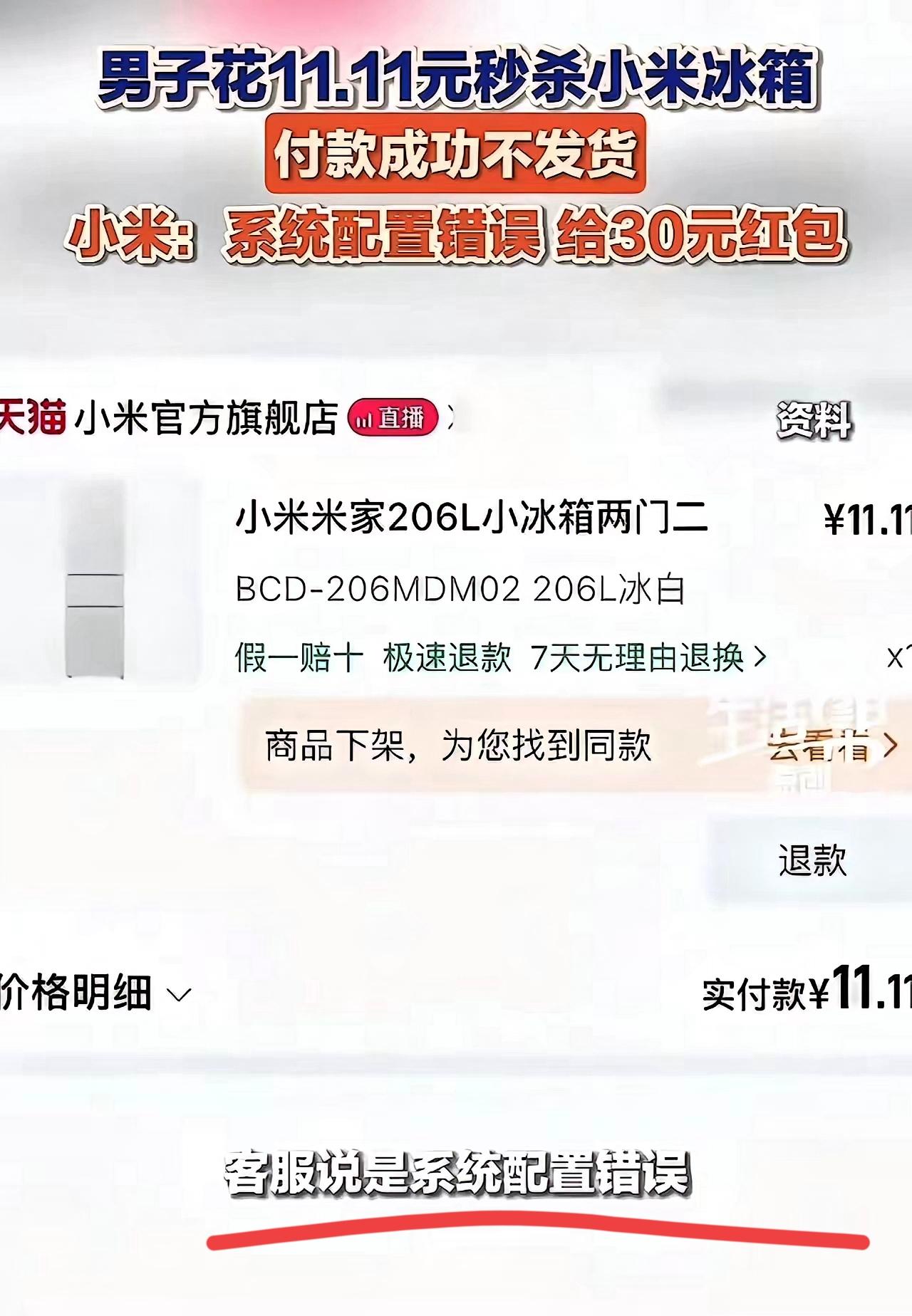 小米这操作也太没契约精神了!河南张先生双十一11.11元秒到冰箱,付款成功后商家竟说系统配置错误,甩30元红包想打发人,这不是把消费者当猴耍吗? 商家用超低价秒杀吸流量,转头就用“失误”当借口毁约,本质就是拿契约当儿戏。更气人的是平台还和稀泥,说商家可能拒发,建议消费者接受补偿,完全把消费者权益当摆设。 30元红包看似是补偿,实则是对信任的践踏。电商行业的根基是信任,要是商家都能随意撕毁订单,平台还纵容,以后谁还敢相信双十一活动? 消费者愤怒的从来不是没拿到低价商品,而是被欺骗、被轻视的屈辱感。信任一旦崩塌,可不是多少钱能买回来的。 你遇到过商家毁约的情况吗?要是你秒到冰箱被拒发,会怎么维权?来评论区聊聊~