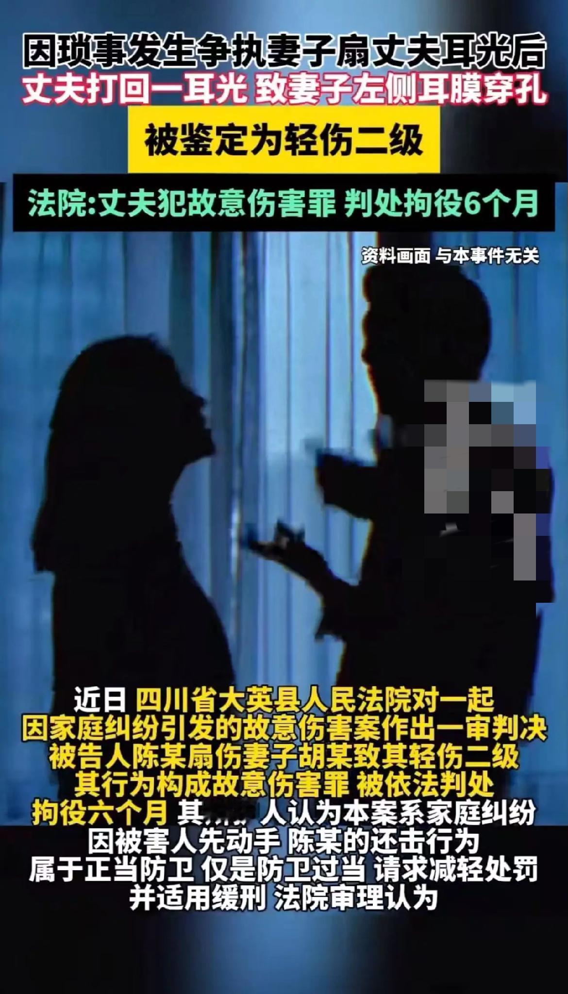 结局用一句话概括:先动手的人,未必最吃亏;伤情重的人,也未必占理。 一、事情经过 1. 女子打电话让丈夫接,丈夫一直不接。 2. 她自己打车回家,情绪爆炸,先扇了老公一巴掌。 3. 老公立刻回扇,一耳光造成她左耳鼓膜穿孔。 4. 女子报警并去做伤情鉴定,结论:轻伤二级。 二、法律后果 1. 刑事层面 丈夫被认定构成故意伤害罪,法院判处拘役6个月。 理由:轻伤二级已达刑事立案标准,即便是“还手”,也不属于正当防卫,而是互殴中的伤害。 2. 民事层面 妻子可提起附带民事诉讼,要求赔偿医疗费、误工费、护理费等,但因为她先动手存在过错,法院通常会按过错比例减轻丈夫赔偿额。 3. 家暴认定 夫妻之间的耳光,只要造成明显身体损伤或精神恐惧,就可以被认定为家庭暴力;谁动手、谁受伤,并不影响家暴成立,只是责任大小不同。 三、关键教训 1. “她先动手”只能减责,不能免责——丈夫仍要为自己那一巴掌的“结果”承担刑责。 2. 耳膜穿孔6周不愈合即构成轻伤,迈入“判刑”门槛,还手前请先算成本。 3. 遭遇争吵,第一时间离开现场或报警,比“扇回去”更省钱、更省自由。 四、给网友的三个选择题 1. 如果你先被伴侣扇耳光,你会: A 报警固定证据 B 立刻还手 C 转身离开 2. 你觉得丈夫拘役6个月判轻了还是重了? 3. 互殴中,伤情重就等于有理吗? 把答案写在评论区,让下一位“情绪上头”的人先看完再动手! 轻伤害刑事案件 打架轻伤鉴定