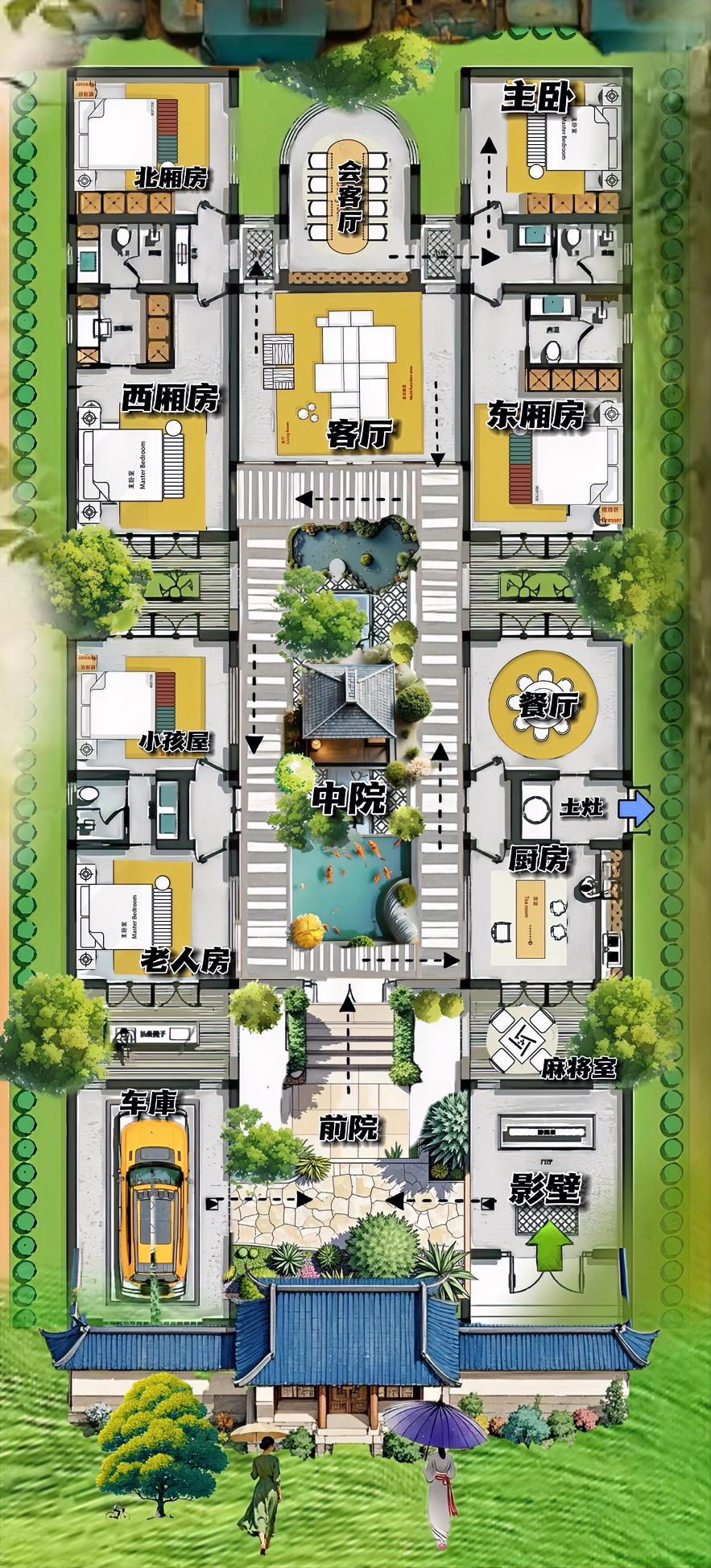我心目中最好的合院,六居是标准的国泰民安脸,花园是标准的大家闺秀,448㎡推𥰡敲打磨后,是自建房里的天花板! 前阸,一拐三折叠,已是最惊鸿的布局,比如说鹤立鸡群的影壁,有窗景的东库,让一进院的面子活,做的收缩自如! 中院,也就是二进院,古早韵味最浓郁,金鱼池管财,花亭子管景,山石管意境,十四米长院子呈现出现出诗意秘境! 古琴一响,代入感拉满,完全是田园自建房天花板! 后院不繁杂,却精致,休闲厅如观景台!不熟悉的人布局,180度窗户觉得太浪费,其实让三进院,一个起跑线,藏的深,不代表没色彩! 妙布局,灵动线,四天井,以大平层的大小,打造出最经济实惠的四合院,循环看十遍,我觉的都不够~ 说白话,烟火气精致,面子不精致,与接地气是绝配,三代同堂宽大,四代同堂刚合适! 为啥?细节见人品,中厨藏中岛,也藏得下土灶台,我觉得熟门熟路的乡音自来疯! 布局是合院的灵魂,动线是自建房的智谋,也是现代四合院天花板!