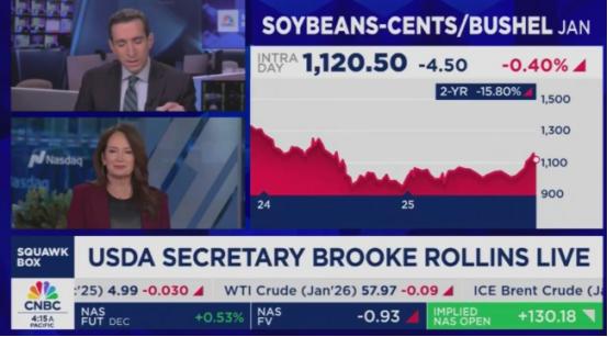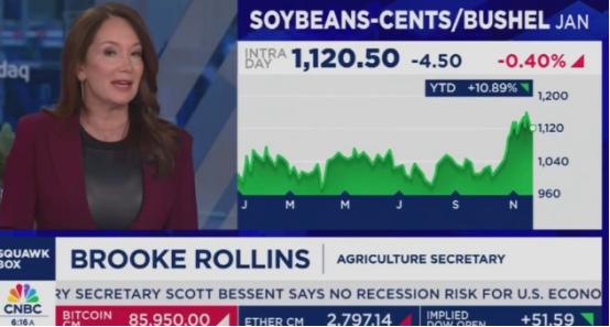美国农业部长布鲁克·罗林斯北京时间11月24日晚接受CNBC采访。 北京时间11月24日晚上,美国农业部长布鲁克·罗林斯坐在CNBC的演播室里,面对主持人抛出的大豆销售问题,脸上的表情有点绷不住了。 当被问到“白宫之前说中国会在1月份之前买1200万吨美国大豆,现在眼看就剩一个多月了,实际才买了33.2万吨,这事儿您怎么看”时,罗林斯顿了顿,只说了句“你的观点非常重要,我们还有很长的路要走”。这话听着客气,明眼人都知道,这是承认了美国大豆对华销售的窘境——离目标还差着十万八千里呢。 可能有人没概念,33.2万吨对比1200万吨是个啥比例?算下来才刚过2.7%,连零头都没到。 要知道中国可是美国大豆最主要的买家,去年一年就买了美国126.4亿美元的大豆,占了美国大豆出口总额的一半还多。可谁能想到,从今年5月开始,中国就没再从美国买过一粒大豆,英国《经济学人》翻了美国近30年的官方记录,说这还是头一回出现这种情况。 这事儿最着急的不是罗林斯,是美国的豆农们。 伊利诺伊州的农场主克里斯·古尔德最近愁得睡不着觉,他跟媒体说,中国一直是他们的头号买家,家里一大半大豆都靠卖给中国过日子,可自从美国开始扰乱国际贸易,中国就转头找别人买了。 更让他糟心的是,今年大豆收成还不错,本以为能卖个好价钱,结果不仅没订单,连储存都成了问题。就在10月15号,他们州马丁顿小镇一座混凝土仓库都被积压的大豆压塌了,里面足足有816吨大豆,看着都心疼。 其实从美国农业部6月份的报告就能看出苗头,当时美国大豆库存就达到了10.08亿蒲式耳,比市场预期的还高,同比去年涨了3.9%。随着收获季到来,库存更是越积越多,豆农们的亏损也越来越严重。 《华尔街日报》算过一笔账,今年美国大豆种植户每英亩要亏损差不多100美元,可农机、化肥这些成本还在一个劲地涨,美国农业部估计今年农业生产总支出得4674亿美元,比去年多了120亿。这么一进一出,不少豆农扛不住了,今年上半年美国农场破产数量都涨到2021年以来的最高水平了。 有人会问,中国不买美国大豆,那国内的需求咋满足?别急,中国早就找好了替代来源,巴西就是最大的接盘侠。 虽然10月份的时候巴西大豆报价比美国高了1美元每蒲式耳,让中国榨油企业一度暂停下单,但架不住人家供应稳定啊。 2024年中国总共进口了1.05亿吨大豆,其中从巴西进口的量占了绝大多数,从美国进口的只有2213万吨,而美国第二大买家墨西哥的采购量还不到600万吨,根本填不上中国留下的空缺。 更让美国豆农闹心的是,美国政府的政策还在帮倒忙。特朗普政府今年春天给中国加征关税,直接把中国买家推给了巴西。后来为了缓解国内消费者的不满,又跟阿根廷签了协议,不仅扩大从阿根廷进口牛肉,还给了阿根廷200亿美元救助。 这波操作可把美国豆农气坏了,他们都知道阿根廷正趁机抢中国市场,美国政府这不是帮着外人抢自己人的生意嘛。美国大豆协会8月份就给特朗普写过公开信,协会主席凯莱布·拉格兰直言,关税和销量锐减已经让农民“几乎没有盈利空间”,可直到现在政策也没调整过来。 除了外部的竞争和政策问题,中国国内的变化也让美国大豆没那么吃香了。农业农村部今年一直在推饲用豆粕减量替代行动,大力推广低蛋白日粮技术,还搞了“以草代料”“秸秆变肉”这些措施。 效果还真挺明显,2024年1到10月,全国饲料里的豆粕用量下降了8%,按工业饲料产量2.55亿吨算,相当于少用了127万吨豆粕,自然对大豆的进口需求也没以前那么迫切了。 而且中国海关数据显示,2024年1到11月全国大豆进口量9709万吨,比去年还涨了9.4%,说明中国不是不买大豆,只是不再优先买美国的了。 就在大家都觉得美国大豆对华销售彻底没戏的时候,10月29日有消息说中国在本收获季首次从美国买了大豆,这也是9月份进口为零之后的头一单。 当时特朗普还说中方同意在1月份前买1200万吨,未来三年每年买2500万吨,可中国商务部只说双方就扩大农产品贸易达成共识,没提具体数字。现在看来,那笔订单可能就是现在这33.2万吨,离1200万吨的目标还差得远。 美国大豆协会早就看清了形势,他们的政府事务负责人休斯顿直言“没有一个市场能与中国相提并论”。为了挽回中国买家,协会从今年8月就开始游说政府,可直到现在也没看到实质性进展。 眼看1月份越来越近,库存还在不断积压,豆农们的耐心也快耗尽了。有业内人士说,现在美国大豆就算想跟俄罗斯天然气一样打折促销都未必管用,毕竟巴西大豆已经站稳了脚跟,中国又在搞豆粕替代,美国想抢回市场,真不是喊几句口号就能解决的。
