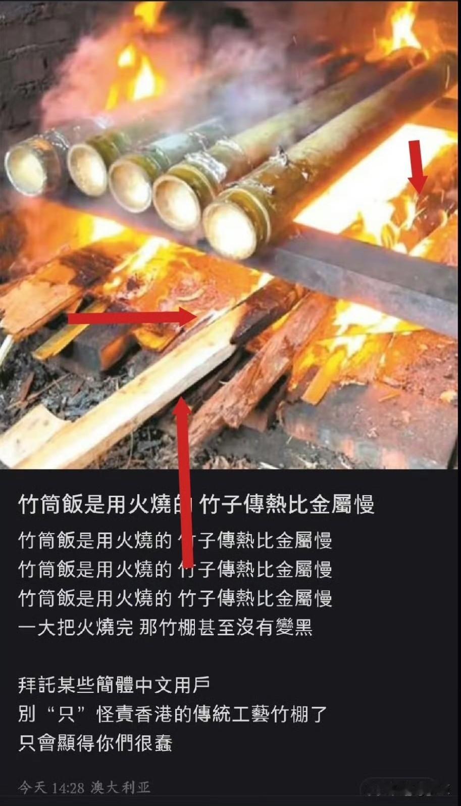 一个澳大利亚人发了一张图片,秀智商。 他写道: 竹筒饭是用火烧的,竹子传热比金属慢。 竹筒饭是用火烧的,竹子传热比金属慢。 竹筒饭是用火烧的,竹子传热比金属慢。 竹筒饭是用火烧的,竹子传热比金属慢。 一大把火烧完,那竹棚甚至没有变黑。 拜托某些简体中文用户, 别“只”怪责香港的传统工艺竹棚了,只会显得你们很蠢。 澳洲的“快乐教育”是这样的?