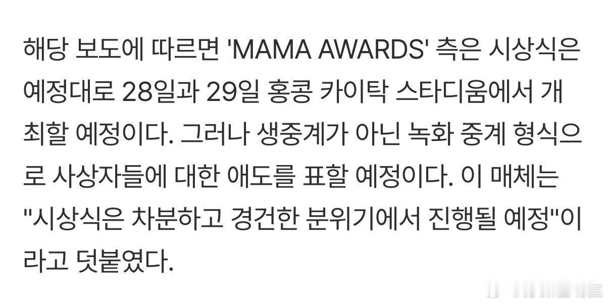 MAMA AWARDS方面计划按原定日程于28日和29日在香港启德体育场举行颁奖典礼。但将以录播形式而非直播方式进行,以表达对遇难者的哀悼。颁奖典礼将在庄重而克制的氛围中进行。