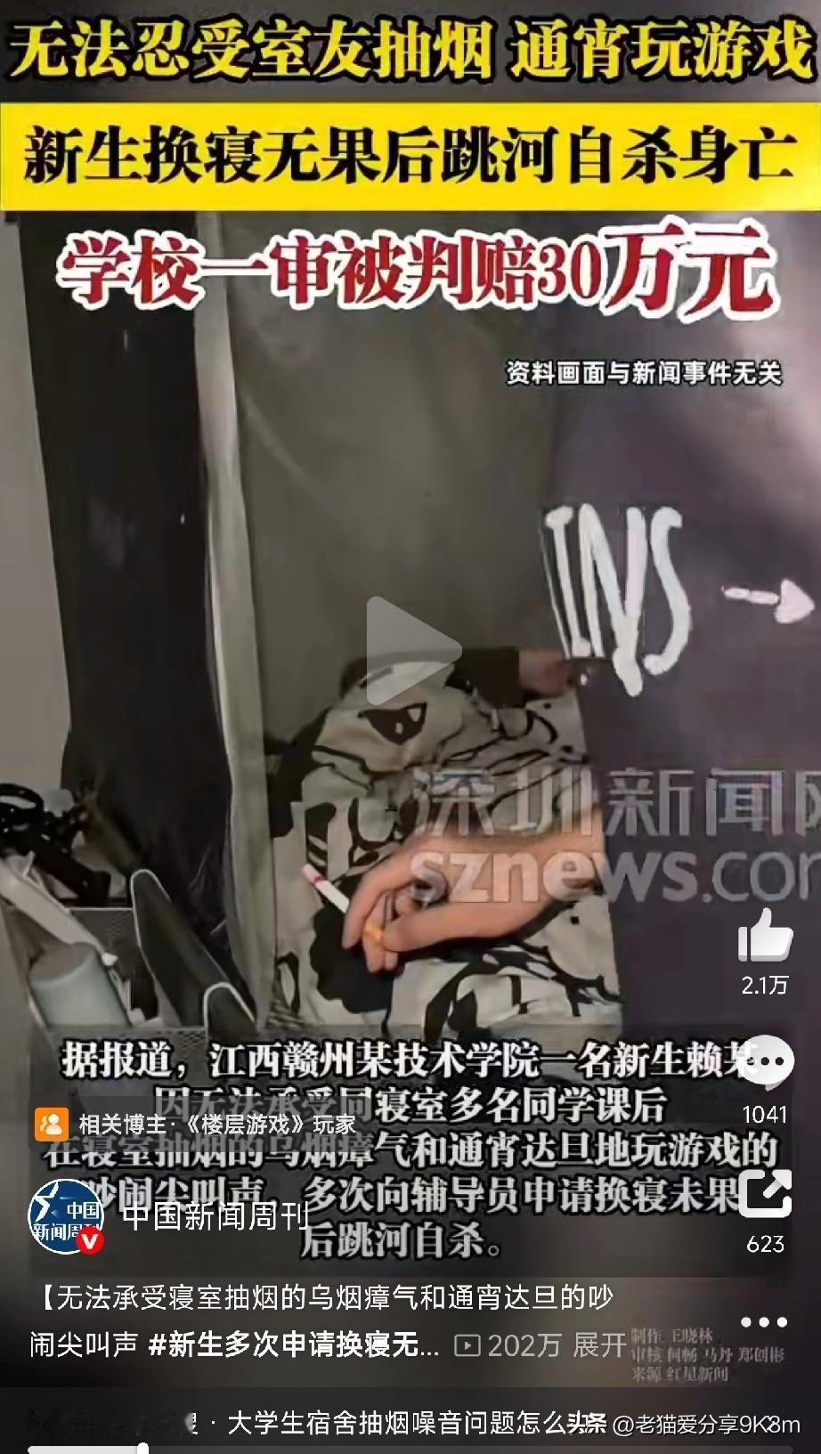 大学生的住宿真是个问题 18岁大学生最后求救语音曝光,学校赔30万,全网追问:早干嘛去了? “他们每天都两点多睡,吵得我睡不着!再这样下去,我真要跳了,真的窒息!” 这是18岁新生小赖发给辅导员的最后语音。三天后,他的生命终结在冰冷的河水中。 入学仅几天,5人宿舍里4个老烟枪 + 通宵游戏党, 他向辅导员苦苦哀求换寝,得到回复:“太远了不好管理” 。 绝望中的“要跳楼”警告,被当成矫情, 直到悲剧发生,学校才慌忙补救——赔30万 。 网友痛心质问: “30万赔得了一条命吗?” “学生喊‘要跳楼’都不管,非要等出事了才重视?” “抽烟扰民明明违反校规,为什么没人管?” 这不是孤例: 多少学生正在经历“地狱宿舍”, 二手烟呛到咳嗽失眠, 深夜键盘声震耳欲聋, 换寝申请石沉大海, 辅导员的敷衍寒了多少人的心! 血的教训警示所有学校: 学生的每一次求助都可能是最后的呼救,宿舍管理不能“装睡” ,心理危机干预必须跑在悲剧前面。 (文章素材来自中国新闻周刊,侵删)
