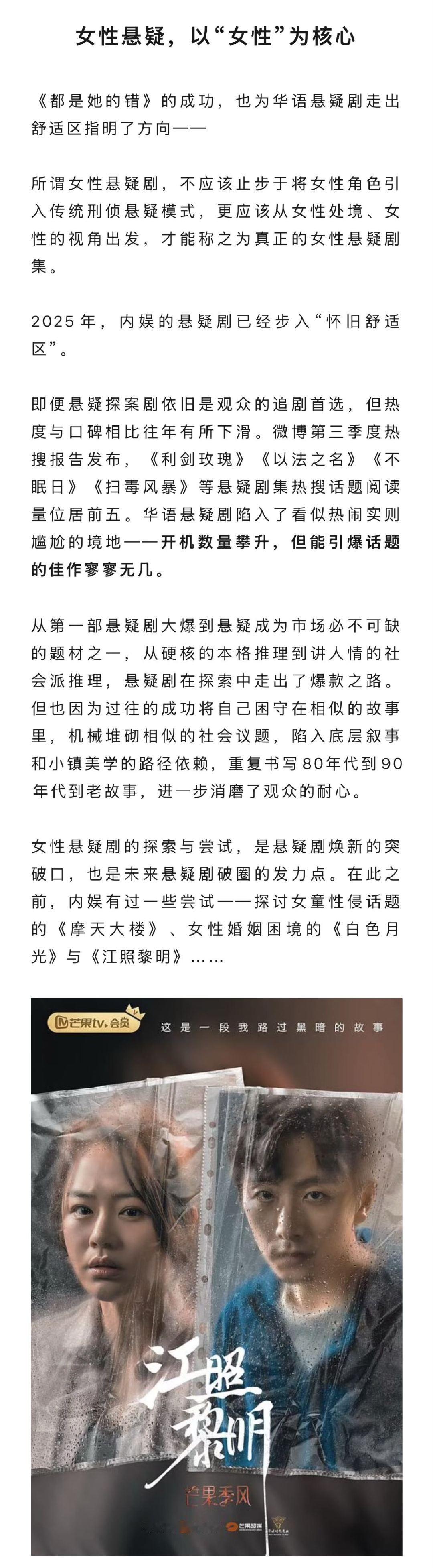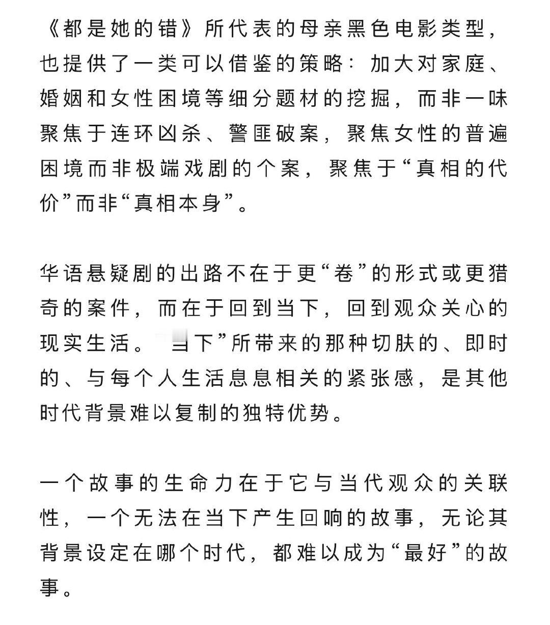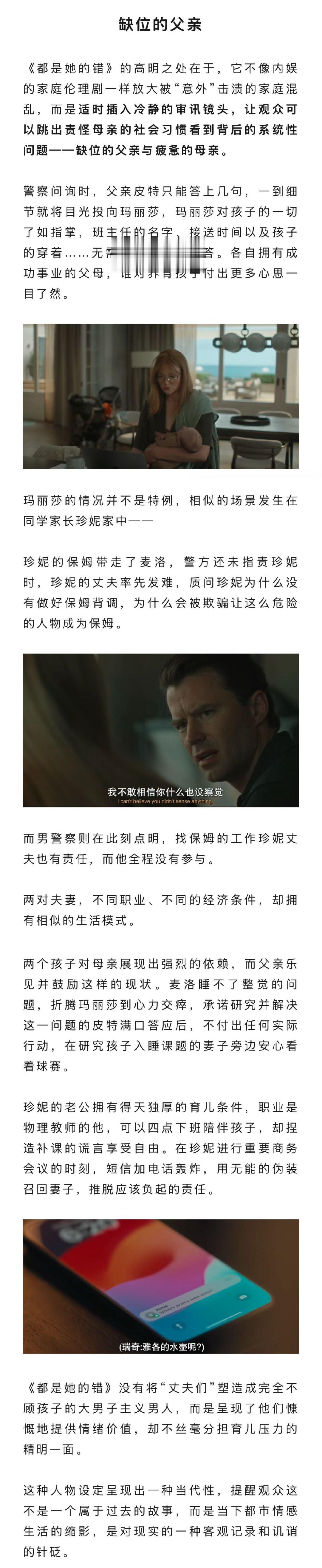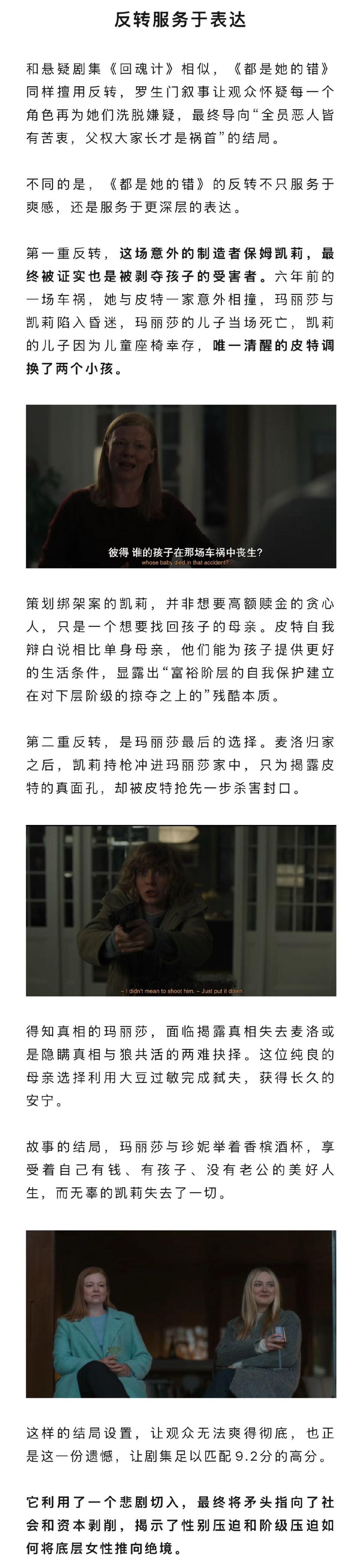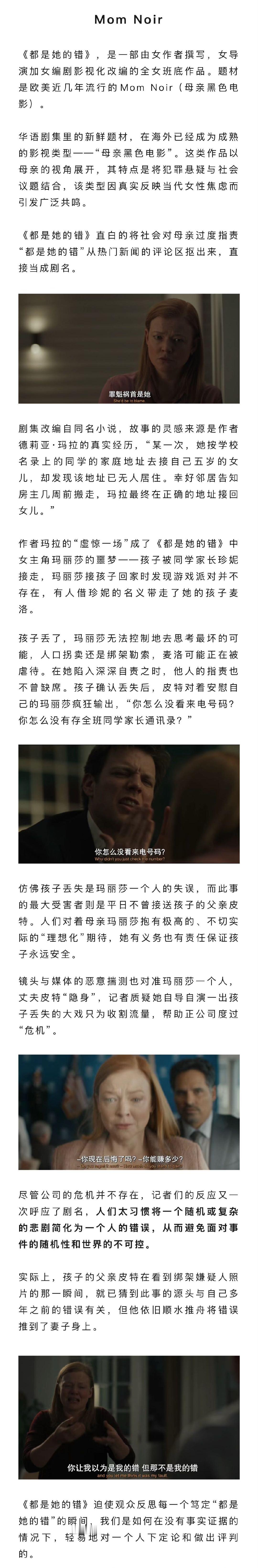 都是她的错灵感源自作者真实经历女性悬疑还可以这么拍《都是她的错》是一部由女作者撰写,女导演加女编剧影视化改编的全女班底作品。题材是欧美近几年流行的Mom Noir,它将“当下性”与深度平衡得刚好,用层层反转指向层层升级的性别与阶级矛盾。