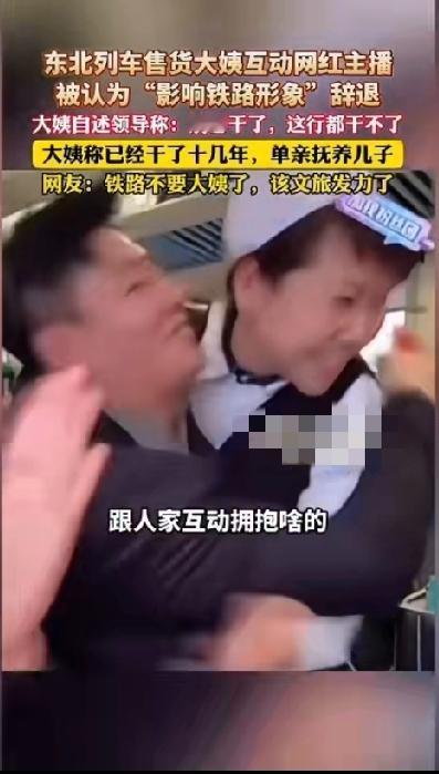 东北列车售货大妈互动网红主播,被认为“影响铁路形象”而辞退。大姨自述领导称:“别想干了,这行都干不了”,大妈称自己已经干了十几年,一直单亲抚养儿子…… 事件经网上这么一发酵,我猜要不了多久,大妈很快会被要求继续工作,就是不知道他们会整出一套什么样的说辞?要说懂得变动、懂得抓住流量这一块,东北的这些领导真的是落后南方这些领导几个档次。这种事情但凡发生在南方,人家领导巴不得这种流量砸自己头上了。 评论区的诸位大神,这个事情上你们是什么看法?
