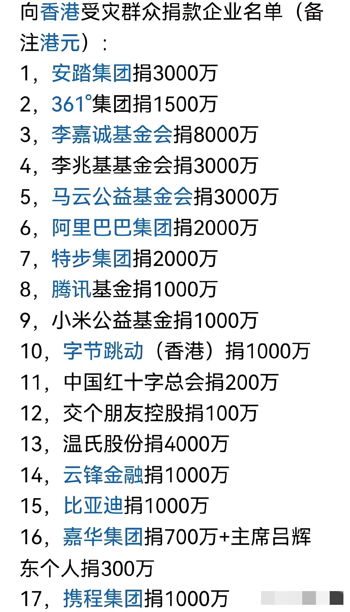 香港受灾群众捐款的企业单位,李嘉诚基金会捐款8000万,这里面目前最多的。
