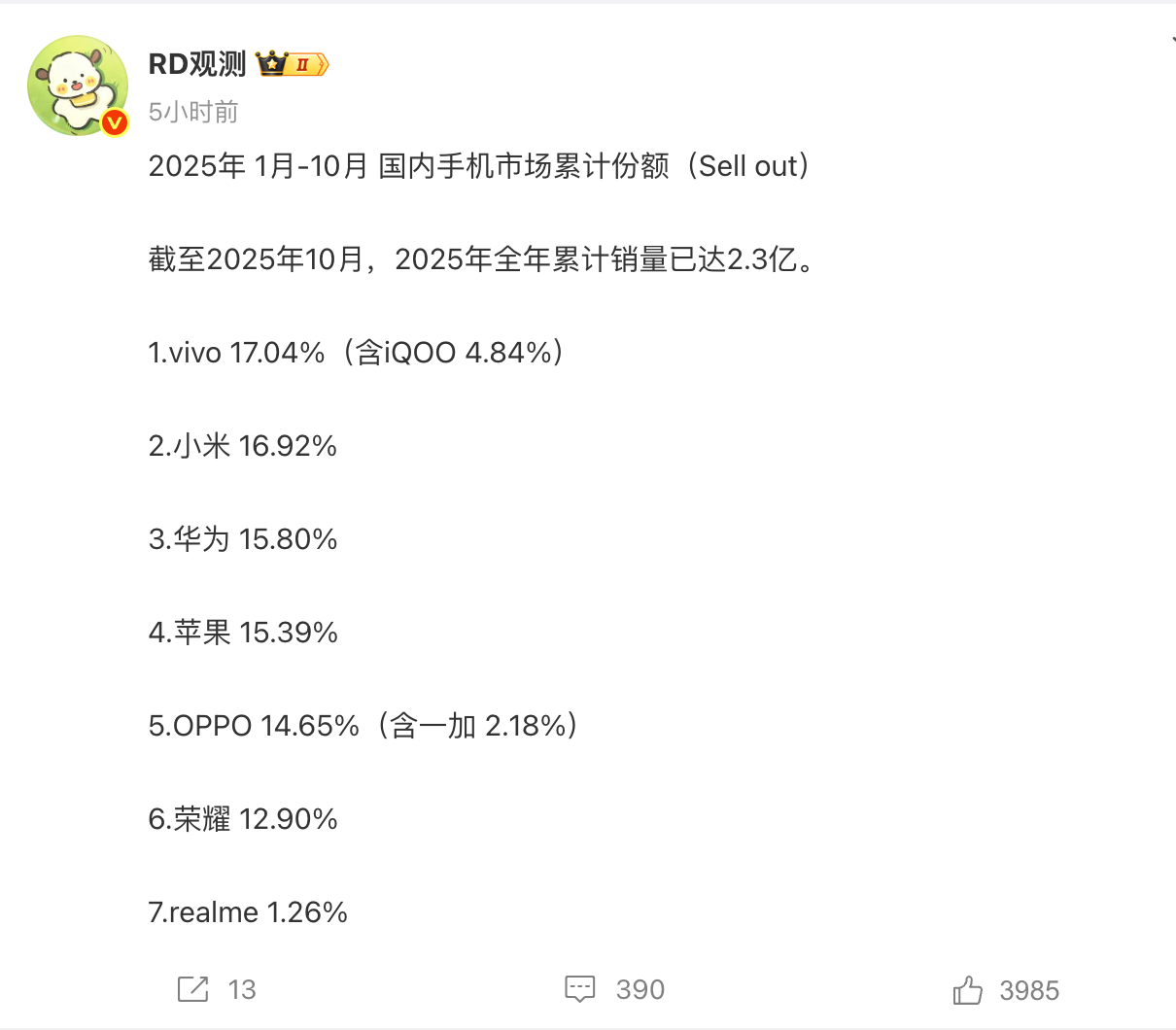 一点也不意外,今年国内手机厂家前三还是vivo、小米、华为! 虽然今年还有一个多月,但是整体上国内销量冠军还是vivo的可能性很大(2024年国内销冠就是vivo的)。 目前vivo的市占比还控制在17%以上,但今年下半年小米的表现依然强势,缩小了和vivo的差距(今年小米17Pro和小米17ProMax比起去年的小米15系列销量是有提升的,K90ProProMax也不再是绿叶机)。 现在就看vivo的线下走量机S50系列发布会不会再拉一下数据,不然年底被反转也不是不可能(虽然最近小米和雷军网上风评不怎么样,但手机的销量貌似是没受到影响,小米17系列已经200万+了)。 第二档就是华为、苹果、OPPO要稍微差一点,但是把真我加上,市占率也有15.91,三家比较接近。年底iPhone17和Mate80两家旗舰都发布了,就看接下来谁卖得更好了。 说实话,今年OPPO掉队有点明显,高端系列OPPO Find X9目前看来跟上代差不多,但是一加貌似退步了,再就是Reno系列,今年没那么强势。 至于荣耀,高端旗舰Magic8系列在高端机中相对萎靡,但是中低端的数字系列、X系列反而卖得比较不错。