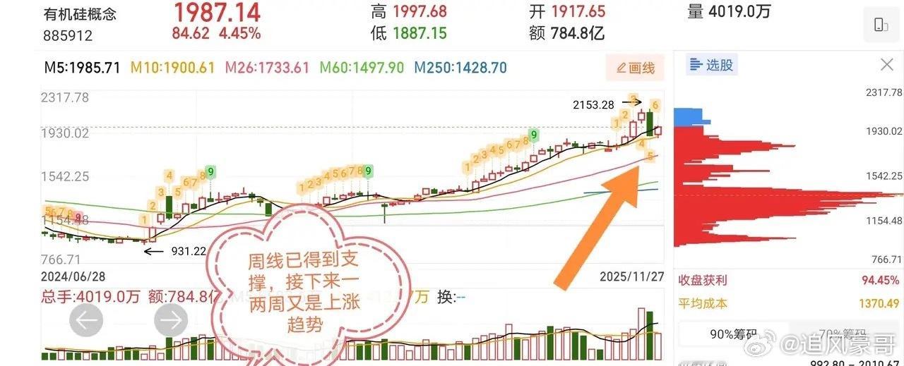 11.27十大技术交易热门人气股票点评1、实达集团:突破利空消息,止盈止损2、遥望科技:高开低走暴力洗盘,等待止跌3、特发信息:断板震荡,拉高止盈4、国晟科技:二波拉升。持股观望5、新华都:天量天价高开低走,止盈出局6、安妮股份:震荡上行。高抛低吸7、雷科防务:高开低走,回调开始8、广济药业:倍量涨停,谨防回调9、赛微电子:涨幅过大,谨防回调10、航天动力:近两日波动剧烈,谨防跳水有机硅概念板块点评: 有机硅行业正经历供需格局优化,减产共识推动价格反弹,新能源需求驱动长期增长潜力。大事预告: 2025年12月初行业计划启动30%减产,目标价格13500元/吨,执行情况将直接影响短期供需与价格走势。板块周线支撑上涨,日线有抬头趋势。是个低吸进货的好时机,兄弟们自行选择好股票