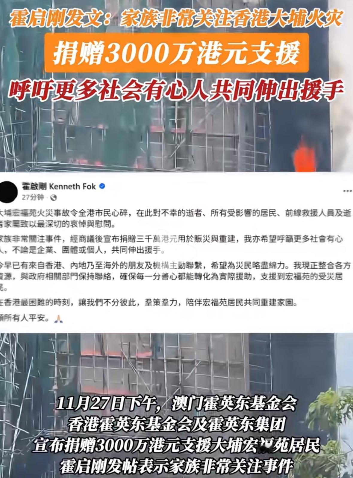 霍启刚宣布,家族捐出3000万港元,相当有责任和格局,身在香港,倡导更多人站出来帮助,霍家承担起来了,带头表率! 霍家在大是大非面前,做的相当的成功,家族越来越强大,事业也是遍及全球,真好的一家人,有别于很多富贵家族! 香港的火灾,火灾无情,人间有情,真的表现的淋漓尽致!