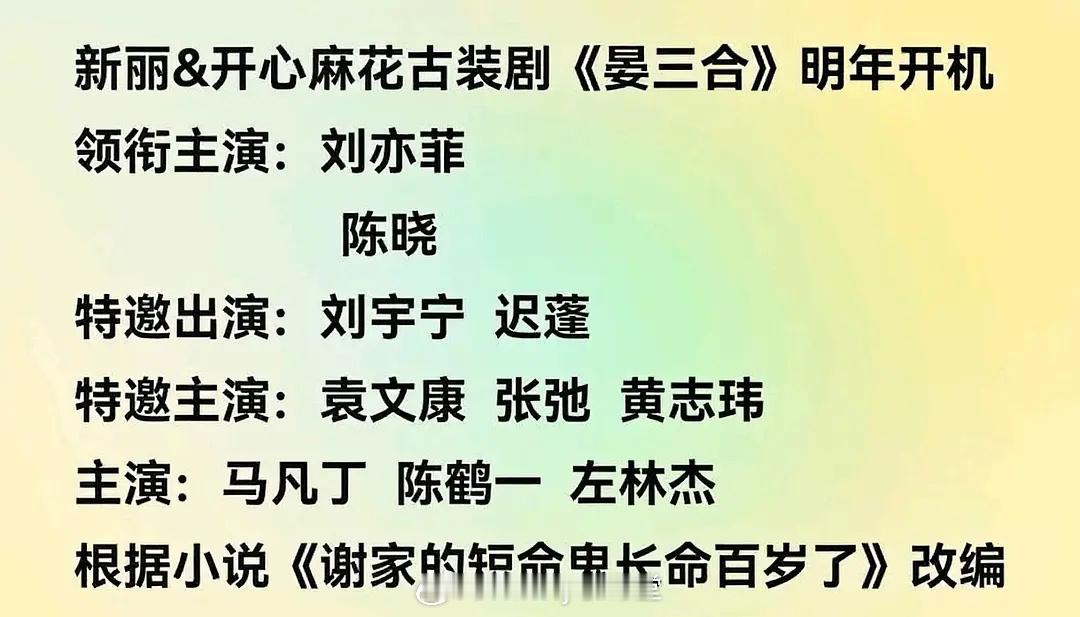 又变了!刘亦菲、陈晓二搭不是现偶,瓜主说是古偶《晏三合》,根据小说改编电视剧,而且男女主是少男少女……应该会找年轻演员演这段吧