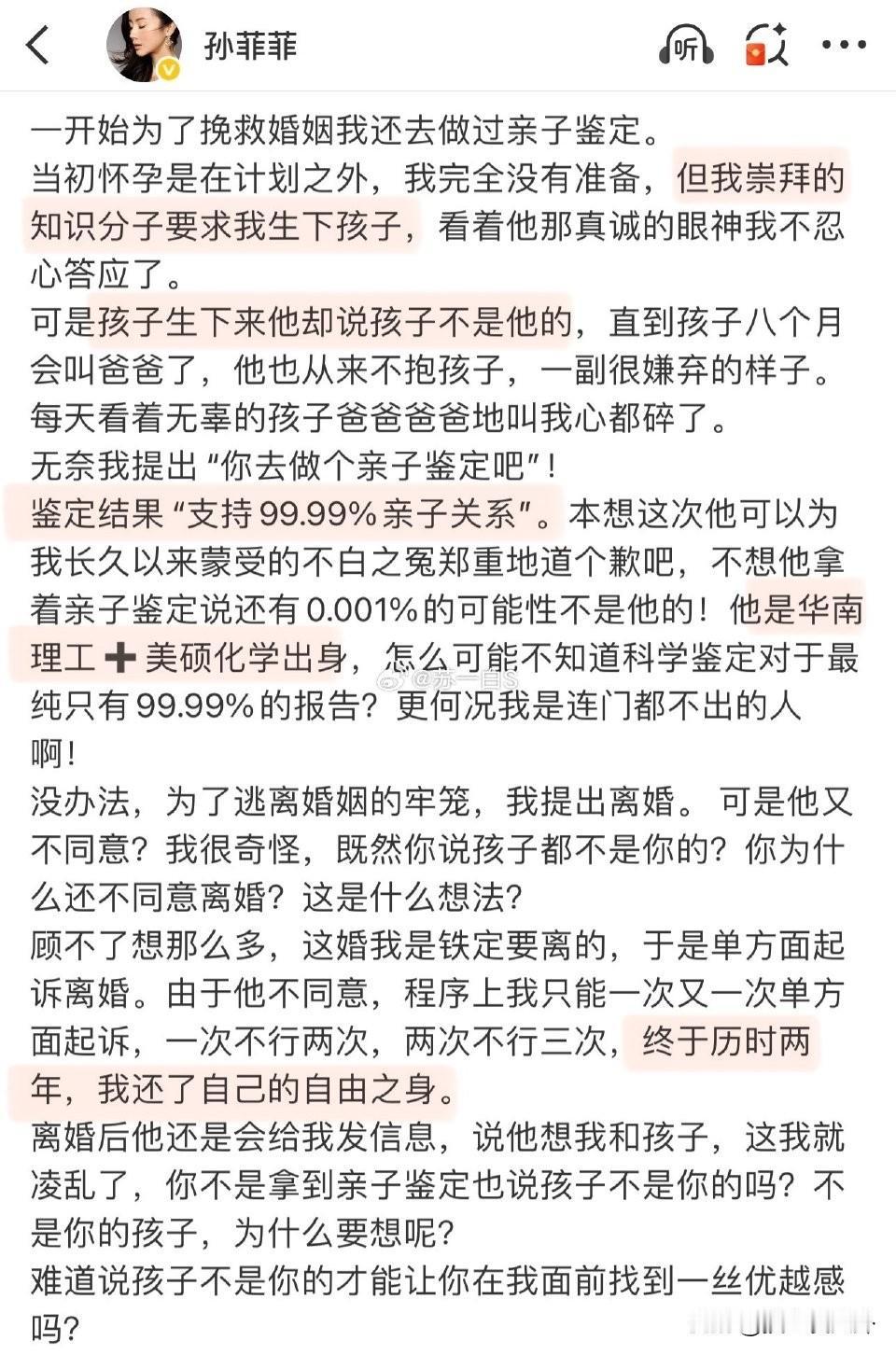 高学历不等于人品也高 这句话的含金量还在上升 亲子鉴定99.99%孙菲菲前夫都不承认孩子是亲生的。就因为当时孙菲菲未婚先孕,她前夫不相信她。 而她前夫还是化学专业研究生,不是水硕,是华南理工➕留美硕士!他真的不懂吗? 不是的,他就是要给女的泼脏水,精神控制女的,才会说出还有0.001%的可能不是他的孩子! 还好离了!虽然离婚过程也是费了很大周折。