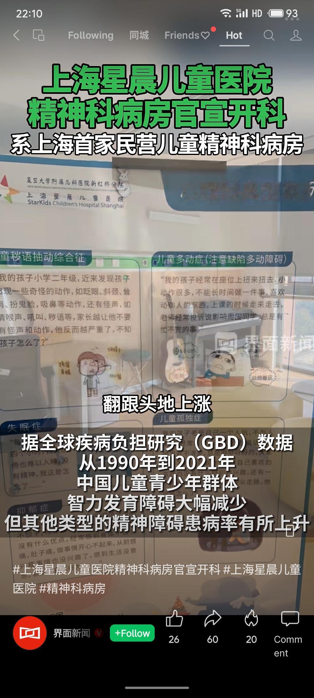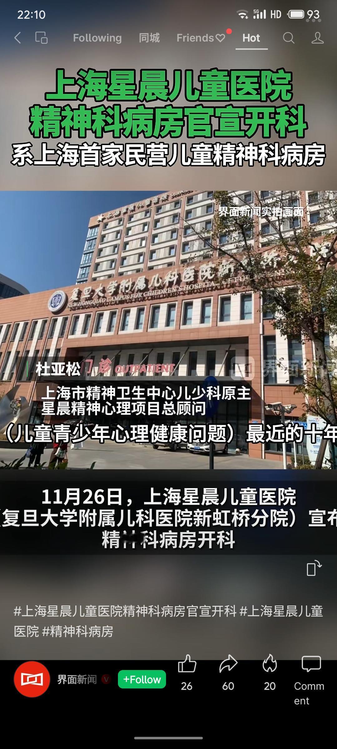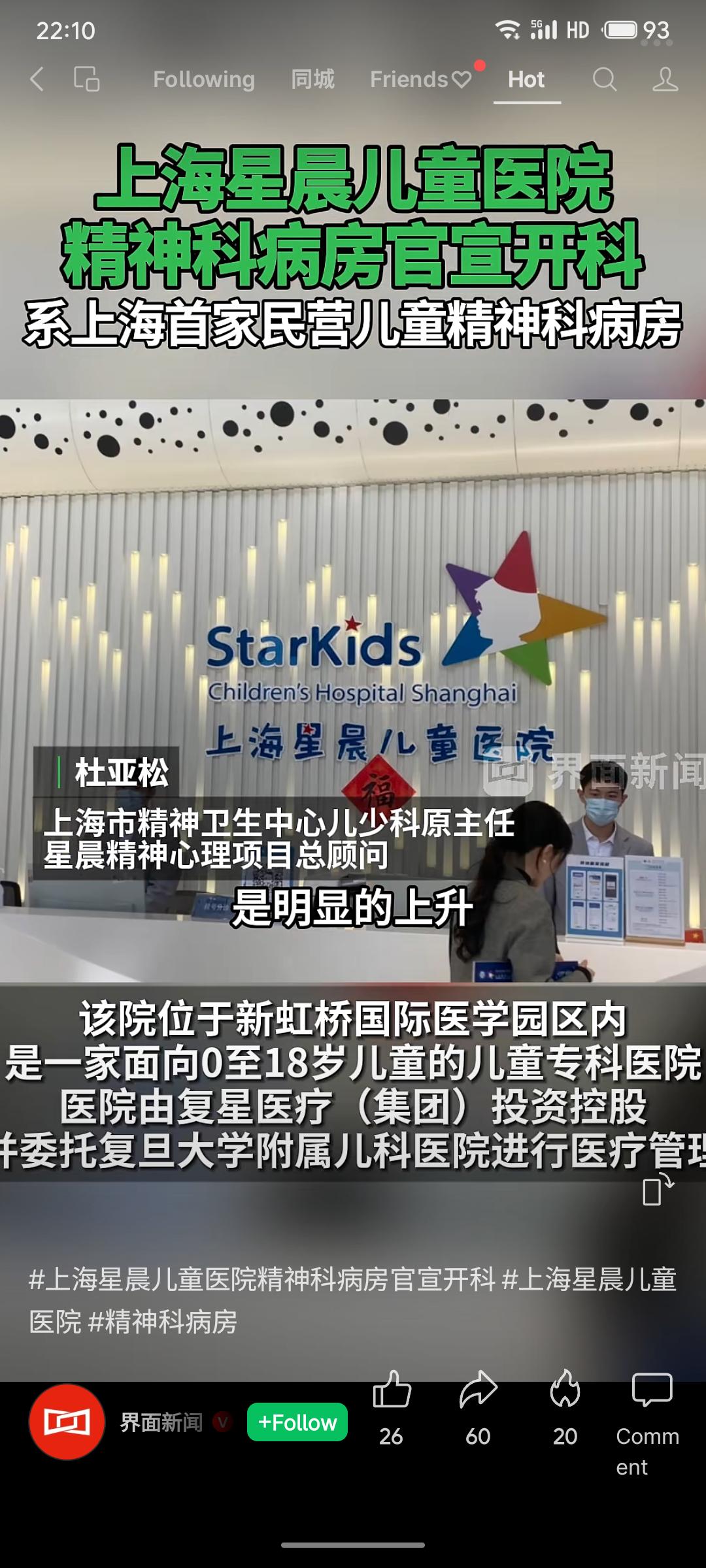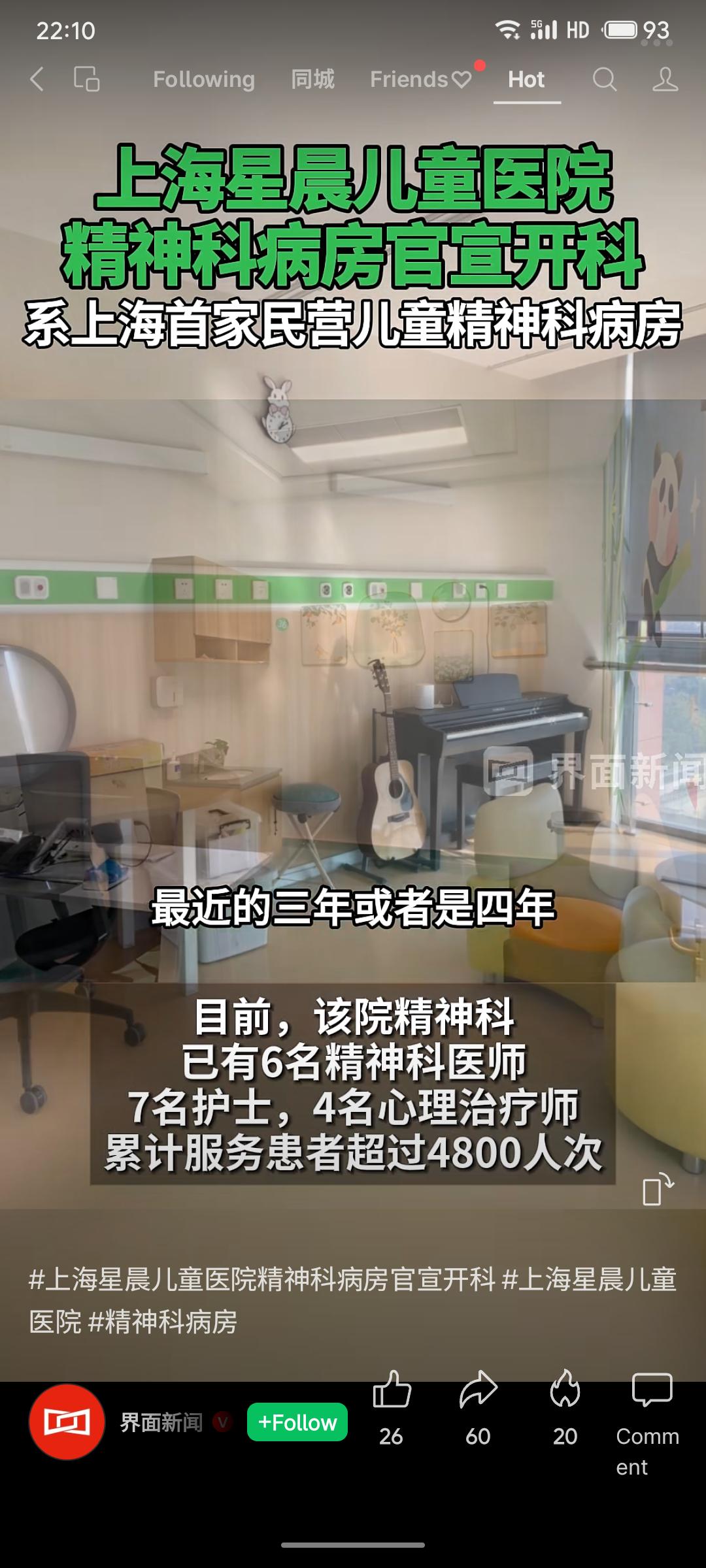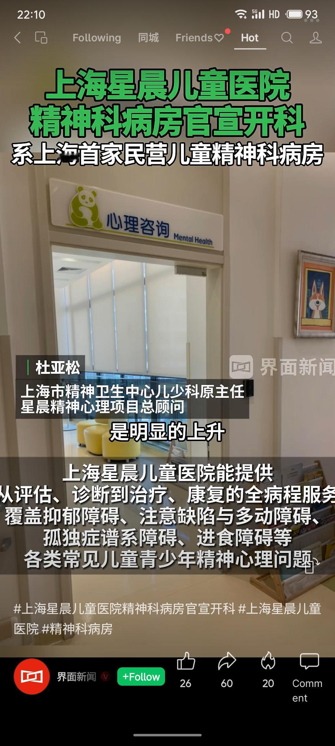 上海星晨儿童医院近日宣布精神科病房正式开科,成为上海首家设立儿童精神科病房的民营医院。该院面向0至18岁儿童青少年,提供从评估、诊断到治疗康复的全病程服务,覆盖抑郁、多动症、孤独症等多种心理问题。目前科室已有6名医师、7名护士及4名心理治疗师,累计服务超4800人次,应对近年来儿童青少年心理健康问题日益凸显的需求。