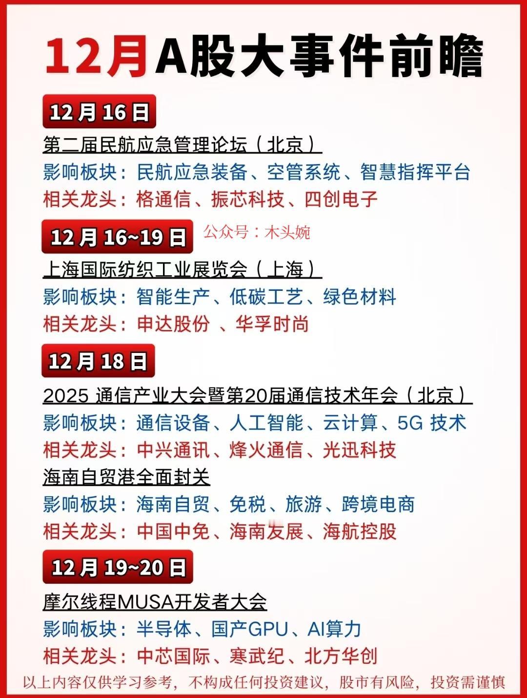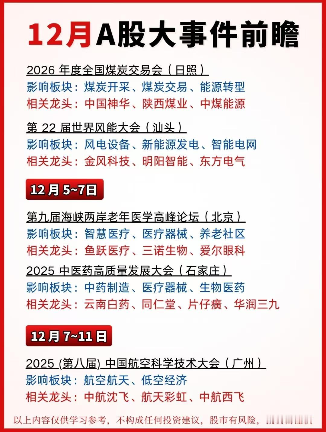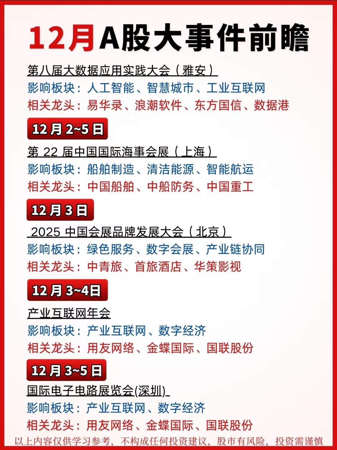 十二月重大财经事件提前看! 根据公开资料显示,十二月份值得关注的财经事件有人工智能产业生态大会、大数据应用大会、产业互联网年会、算力产业大会、通信技术年会、世界风能大会、海南自贸港封关等等,相关事件题材概念龙头代表有哪些? (1)2025“人工智能+”产业生态大会由中国互联网协会主办,将于12月1日 - 3日在北京中关村举办,人工智能龙头代表有科大讯飞、浪潮软件等等。 (2)2025算力产业生态高质量发展大会定于12月11日在北京举办,大会主题为“协同·跃升·赋能”。算力概念龙头代表有数据港、中科曙光等等。 (3)2026年度全国煤炭交易会将于2025年12月3日 - 5日在山东日照召开,主题是保障煤炭安全稳定供应。相关概念龙头代表有陕西煤业、中国神华…… 理财有风险入市需谨慎!資料全网公开透明,仅供参考不能作为投资依据。