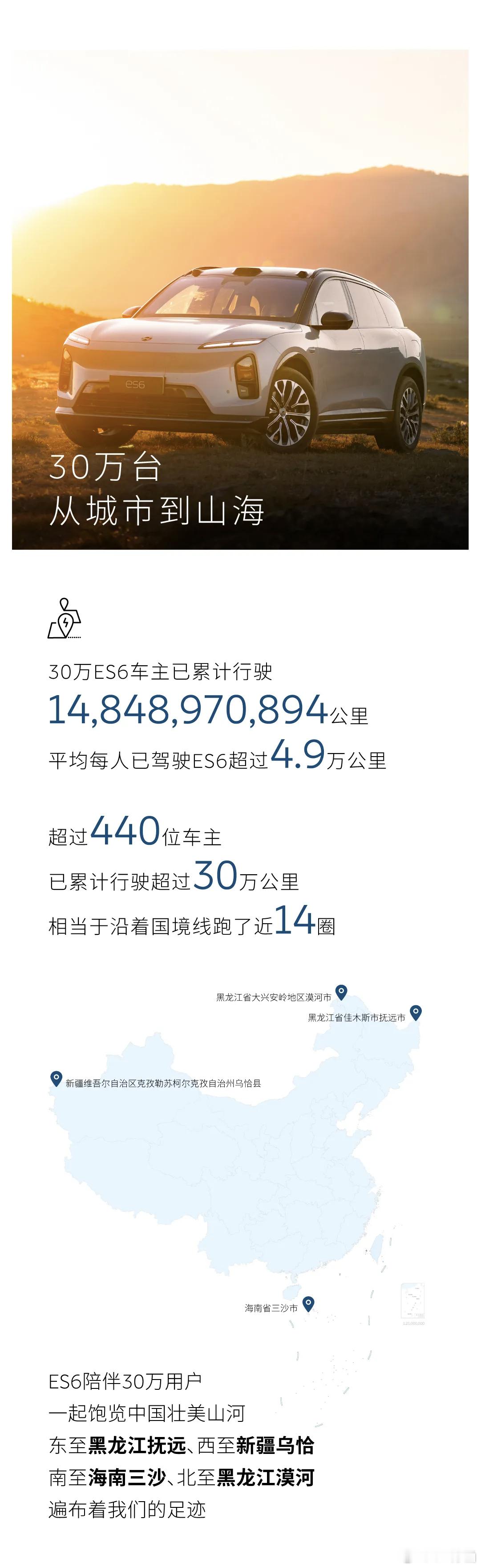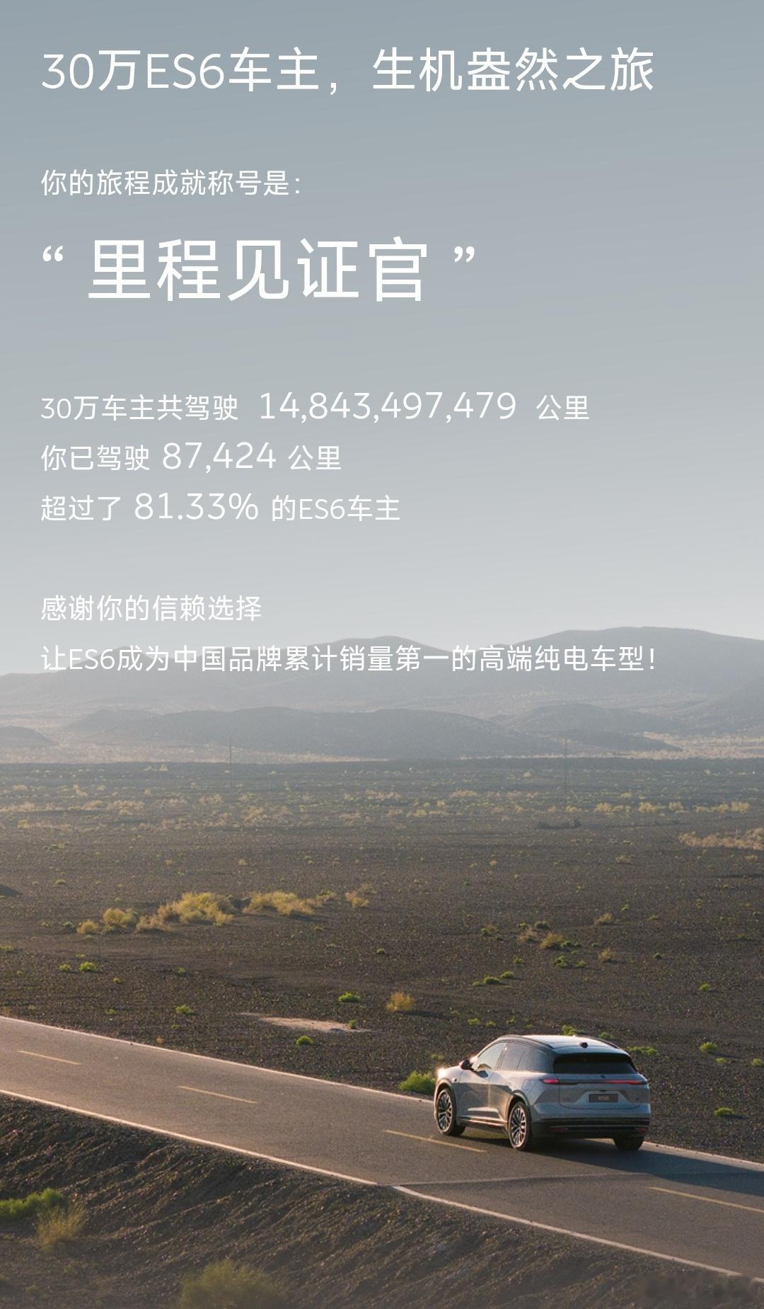 原来,我是全宇宙第10365位蔚来ES6车主各位老6车主,你们都生成了自己的用车报告了吗?我刚才看到蔚来ES6 30万辆纪念活动里面可以生成专属报告,挺有意思的。▷ ES6卖得最好的颜色是星灰,内饰是珍珠贝。▷ 付费选装最多的,必须是NOMI的小脑袋!▷ ES6用户累计行驶里程超过148亿公里!▷ 超过440位用户行驶里程超过30万公里▷ 但是我只开了8万多公里,实在开不过来啊▷ 有近4成的行驶里程,是辅助驾驶开的。有一说一,蔚来第一代的高速领航辅助放到现在依然是好用的。▷ 我和小公主跟NOMI说了9000句话了!▷ 5年多我只换了334次电,羊毛也没有薅得很狠啊▷ 2020年初我提车的时候只有200多座换电站,现在已经有3500+座,换电的体验当然是越来越好!有排名前100,并且还在开的老6车主吗?晒一下,让我膜拜一下